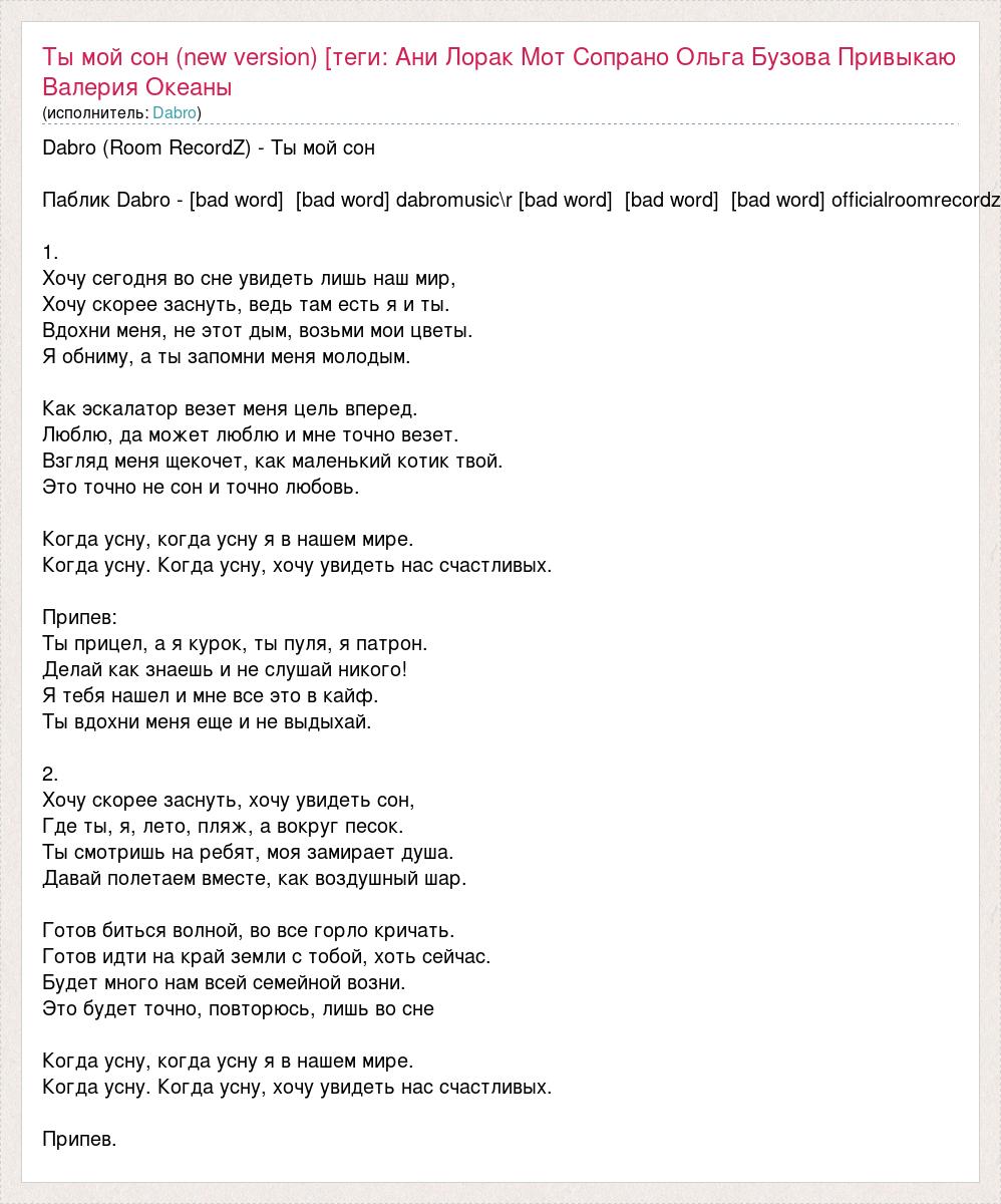 Dabro (Room RecordZ) - Ты мой сон Паблик Dabro - [bad word] [bad word] dabromusic [bad word] [bad word] [bad word] officialroomrecordz 1. Хочу сегодня во сне увидеть лишь наш мир, Хочу скорее заснуть, ведь там есть я и ты. Вдохни меня, не этот дым, возьми мои цветы. Я обниму, а ты запомни меня молодым. Как эскалатор везет меня цель вперед. Люблю, да может люблю и мне точно везет. Взгляд меня щекочет, как маленький котик твой. Это точно не сон и точно любовь. Когда усну, когда усну я в нашем мире. Когда усну. Когда усну, хочу увидеть нас счастливых. Припев: Ты прицел, а я курок, ты пуля, я патрон. Делай как знаешь и не слушай никого! Я тебя нашел и мне все это в кайф. Ты вдохни меня еще и не выдыхай. 2. Хочу скорее заснуть, хочу увидеть сон, Где ты, я, лето, пляж, а вокруг песок. Ты смотришь на ребят, моя замирает душа. Давай полетаем вместе, как воздушный шар. Готов биться волной, во все горло кричать. Готов идти на край земли с тобой, хоть сейчас. Будет много нам всей семейной возни. Это будет точно, повторюсь, лишь во сне Когда усну, когда усну я в нашем мире. Когда усну. Когда усну, хочу увидеть нас счастливых. Припев.