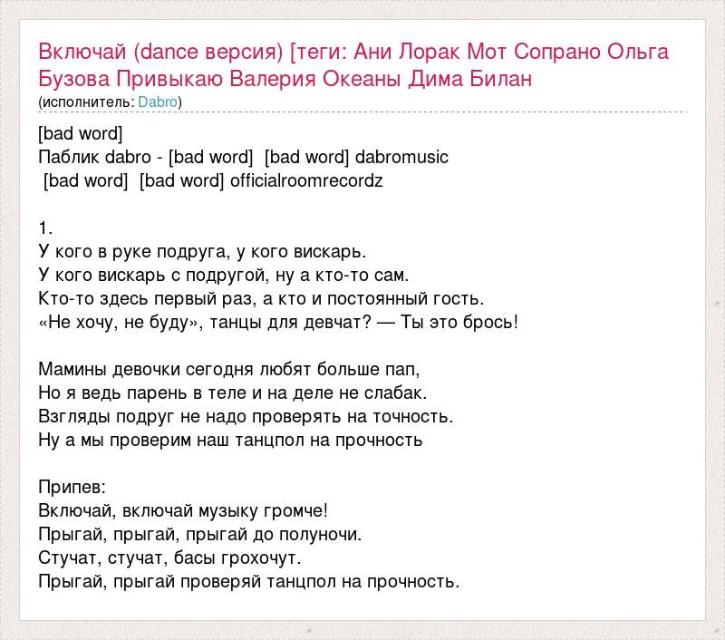 [bad word] Паблик dabro - [bad word] [bad word] dabromusic [bad word] [bad word] officialroomrecordz 1. У кого в руке подруга, у кого вискарь. У кого вискарь с подругой, ну а кто-то сам. Кто-то здесь первый раз, а кто и постоянный гость. «Не хочу, не буду», танцы для девчат? — Ты это брось! Мамины девочки сегодня любят больше пап, Но я ведь парень в теле и на деле не слабак. Взгляды подруг не надо проверять на точность. Ну а мы проверим наш танцпол на прочность Припев: Включай, включай музыку громче! Прыгай, прыгай, прыгай до полуночи. Стучат, стучат, басы грохочут. Прыгай, прыгай проверяй танцпол на прочность.