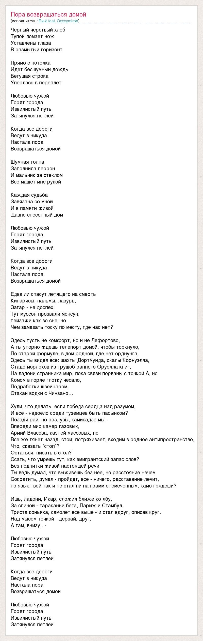 Черный черствый хлеб Тупой ломает нож Уставлены глаза В размытый горизонт Прямо с потолка Идет бесшумный дождь Бегущая строка Уперлась в переплет Любовью чужой Горят города Извилистый путь Затянулся петлей Когда все дороги Ведут в никуда Настала пора Возвращаться домой Шумная толпа Заполнила перрон И мальчик за стеклом Все машет мне рукой Каждая судьба Завязана со мной И в памяти живой Давно снесенный дом Любовью чужой Горят города Извилистый путь Затянулся петлей Когда все дороги Ведут в никуда Настала пора Возвращаться домой Едва ли спасут летящего на смерть Кипарисы, пальмы, лазурь, Загар - не доспех, Тут муссон прозвали монсун, пейзажи как во сне, но Чем замазать тоску по месту, где нас нет? Здесь пусть не комфорт, но и не Лефортово, А ты упорно ждешь телепорт домой, чтобы торкнуло, По старой формуле, в дом родной, где нет орднунга, Здесь ты видел все: шахты Дортмунда, скалы Корнуэлла, Стадо морлоков из трущоб раннего Оруэлла книг, На ладони странника мир, пока связи порваны с точкой А, но Комом в горле глотку чесало, Подработки швейцаром, Стакан водки с Чинзано… Хули, что делать, если победа сердца над разумом, И все - надоело среди туземцев быть пасынком? Позади рай, но раз, увы, камикадзе мы - Впереди мир камер газовых, Армий Власова, казней массовых, но Все же тянет назад, стой, потряхивает, входим в родное антипространство, Что, сказать “стоп”? Остаться, писать в стол? Ссать, что умрешь тут, как эмигрантский запас слов? Без подпитки живой настоящей речи Ты ведь думал, что выживешь без нее, но расстояние нечем Сократить, думал - пройдет, все - ничего, расставание лечит, но язык твой так и не стал ни на грамм онемеченным, камо грядеши? Ишь, ладони, Икар, сложил ближе ко лбу, За спиной - тараканьи бега, Париж и Стамбул, Триста коньяка, самолет все выше - и стал вдруг, описав круг. Над мысом точкой - дерзай, друг, А там, внизу.. - Любовью чужой Горят города Извилистый путь Затянулся петлей Когда все дороги Ведут в никуда Настала пора Возвращаться домой Любовью чужой Горят города Извилистый путь Затянулся петлей