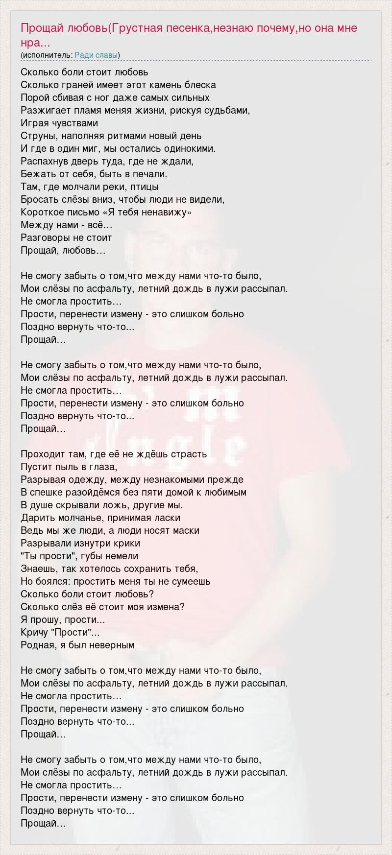 Сколько боли стоит любовь Сколько граней имеет этот камень блеска Порой сбивая с ног даже самых сильных Разжигает пламя меняя жизни, рискуя судьбами, Играя чувствами Струны, наполняя ритмами новый день И где в один миг, мы остались одинокими. Распахнув дверь туда, где не ждали, Бежать от себя, быть в печали. Там, где молчали реки, птицы Бросать слёзы вниз, чтобы люди не видели, Короткое письмо «Я тебя ненавижу» Между нами - всё… Разговоры не стоит Прощай, любовь… Не смогу забыть о том,что между нами что-то было, Мои слёзы по асфальту, летний дождь в лужи рассыпал. Не смогла простить… Прости, перенести измену - это слишком больно Поздно вернуть что-то... Прощай… Не смогу забыть о том,что между нами что-то было, Мои слёзы по асфальту, летний дождь в лужи рассыпал. Не смогла простить… Прости, перенести измену - это слишком больно Поздно вернуть что-то... Прощай… Проходит там, где её не ждёшь страсть Пустит пыль в глаза, Разрывая одежду, между незнакомыми прежде В спешке разойдёмся без пяти домой к любимым В душе скрывали ложь, другие мы. Дарить молчанье, принимая ласки Ведь мы же люди, а люди носят маски Разрывали изнутри крики "Ты прости", губы немели Знаешь, так хотелось сохранить тебя, Но боялся: простить меня ты не сумеешь Сколько боли стоит любовь? Сколько слёз её стоит моя измена? Я прошу, прости... Кричу "Прости"... Родная, я был неверным Не смогу забыть о том,что между нами что-то было, Мои слёзы по асфальту, летний дождь в лужи рассыпал. Не смогла простить… Прости, перенести измену - это слишком больно Поздно вернуть что-то... Прощай… Не смогу забыть о том,что между нами что-то было, Мои слёзы по асфальту, летний дождь в лужи рассыпал. Не смогла простить… Прости, перенести измену - это слишком больно Поздно вернуть что-то... Прощай…