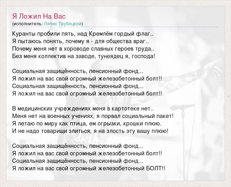 Куранты пробили пять, над Кремлём гордый флаг.. Я пытаюсь понять, почему я - для общества враг.. Почему меня нет в хороводе славных героев труда.. Без меня коллектив на заводе, тунеядец я, господа! Социальная защищённость, пенсионный фонд... Я ложил на вас свой огромный железобетонный болт!! Социальная защищённость, пенсионный фонд... Я ложил на вас свой огромный железобетонный болт!! В медицинских учреждениях меня в картотеке нет.. Меня нет на военных учениях, я порвал социальный пакет! Я летаю по миру как птица, ем огрызки, крошки плюю. И не надо товарищи злиться, я на злость эту вашу плюю! Социальная защищённость, пенсионный фонд... Я ложил на вас свой огромный железобетонный болт!! Социальная защищённость, пенсионный фонд... Я ложил на вас свой огромный железобетонный БОЛТ!!