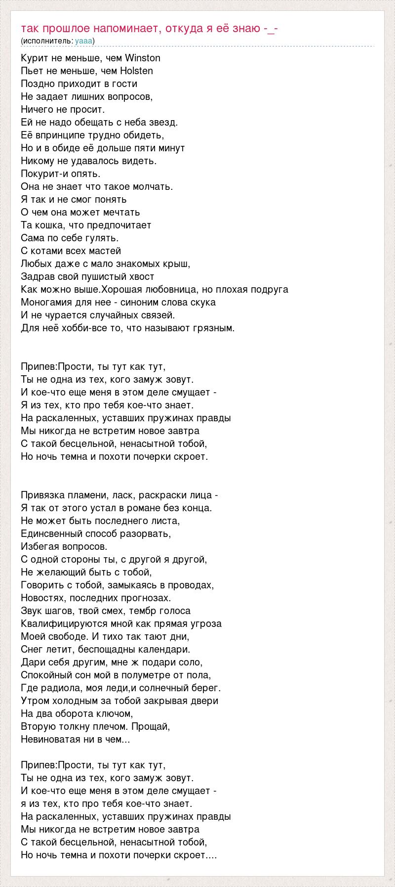 Курит не меньше, чем Winston Пьет не меньше, чем Holsten Поздно приходит в гости Не задает лишних вопросов, Ничего не просит. Ей не надо обещать с неба звезд. Её впринципе трудно обидеть, Но и в обиде её дольше пяти минут Никому не удавалось видеть. Покурит-и опять. Она не знает что такое молчать. Я так и не смог понять О чем она может мечтать Та кошка, что предпочитает Сама по себе гулять. С котами всех мастей Любых даже с мало знакомых крыш, Задрав свой пушистый хвост Как можно выше.Хорошая любовница, но плохая подруга Моногамия для нее - синоним слова скука И не чурается случайных связей. Для неё хобби-все то, что называют грязным. Припев:Прости, ты тут как тут, Ты не одна из тех, кого замуж зовут. И кое-что еще меня в этом деле смущает - Я из тех, кто про тебя кое-что знает. На раскаленных, уставших пружинах правды Мы никогда не встретим новое завтра С такой бесцельной, ненасытной тобой, Но ночь темна и похоти почерки скроет. Привязка пламени, ласк, раскраски лица - Я так от этого устал в романе без конца. Не может быть последнего листа, Единсвенный способ разорвать, Избегая вопросов. С одной стороны ты, с другой я другой, Не желающий быть с тобой, Говорить с тобой, замыкаясь в проводах, Новостях, последних прогнозах. Звук шагов, твой смех, тембр голоса Квалифицируются мной как прямая угроза Моей свободе. И тихо так тают дни, Снег летит, беспощадны календари. Дари себя другим, мне ж подари соло, Спокойный сон мой в полуметре от пола, Где радиола, моя леди,и солнечный берег. Утром холодным за тобой закрывая двери На два оборота ключом, Вторую толкну плечом. Прощай, Невиноватая ни в чем... Припев:Прости, ты тут как тут, Ты не одна из тех, кого замуж зовут. И кое-что еще меня в этом деле смущает - я из тех, кто про тебя кое-что знает. На раскаленных, уставших пружинах правды Мы никогда не встретим новое завтра С такой бесцельной, ненасытной тобой, Но ночь темна и похоти почерки скроет....