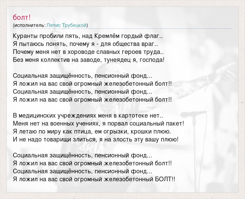 Куранты пробили пять, над Кремлём гордый флаг.. Я пытаюсь понять, почему я - для общества враг.. Почему меня нет в хороводе славных героев труда.. Без меня коллектив на заводе, тунеядец я, господа! Социальная защищённость, пенсионный фонд... Я ложил на вас свой огромный железобетонный болт!! Социальная защищённость, пенсионный фонд... Я ложил на вас свой огромный железобетонный болт!! В медицинских учреждениях меня в картотеке нет.. Меня нет на военных учениях, я порвал социальный пакет! Я летаю по миру как птица, ем огрызки, крошки плюю. И не надо товарищи злиться, я на злость эту вашу плюю! Социальная защищённость, пенсионный фонд... Я ложил на вас свой огромный железобетонный болт!! Социальная защищённость, пенсионный фонд... Я ложил на вас свой огромный железобетонный БОЛТ!!