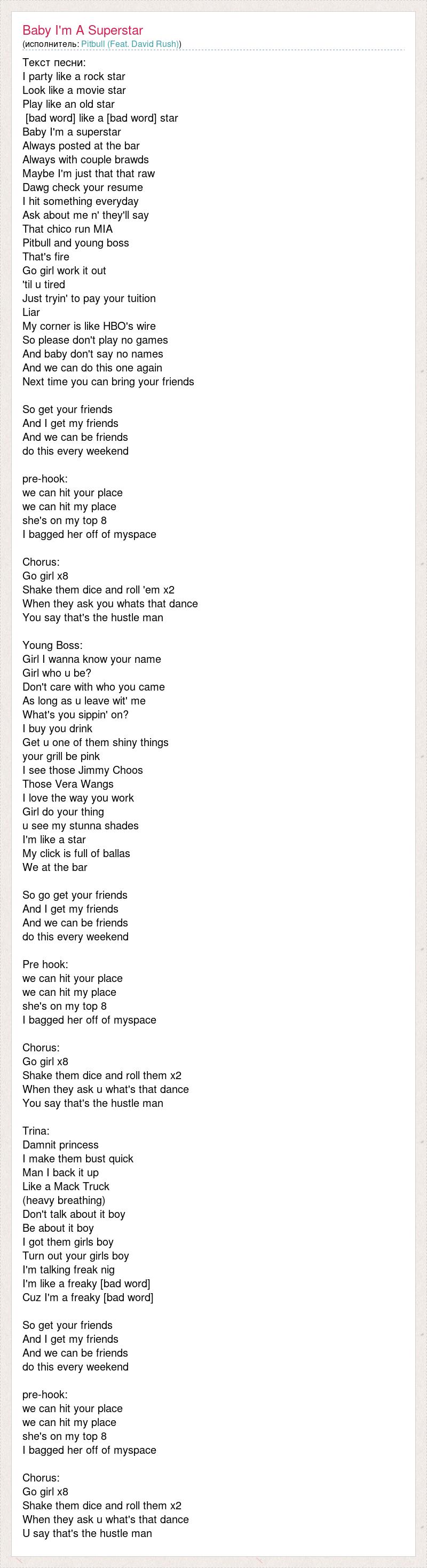 Текст песни: I party like a rock star Look like a movie star Play like an old star [bad word] like a [bad word] star Baby I'm a superstar Always posted at the bar Always with couple brawds Maybe I'm just that that raw Dawg check your resume I hit something everyday Ask about me n' they'll say That chico run MIA Pitbull and young boss That's fire Go girl work it out 'til u tired Just tryin' to pay your tuition Liar My corner is like HBO's wire So please don't play no games And baby don't say no names And we can do this one again Next time you can bring your friends So get your friends And I get my friends And we can be friends do this every weekend pre-hook: we can hit your place we can hit my place she's on my top 8 I bagged her off of myspace Chorus: Go girl x8 Shake them dice and roll 'em x2 When they ask you whats that dance You say that's the hustle man Young Boss: Girl I wanna know your name Girl who u be? Don't care with who you came As long as u leave wit' me What's you sippin' on? I buy you drink Get u one of them shiny things your grill be pink I see those Jimmy Choos Those Vera Wangs I love the way you work Girl do your thing u see my stunna shades I'm like a star My click is full of ballas We at the bar So go get your friends And I get my friends And we can be friends do this every weekend Pre hook: we can hit your place we can hit my place she's on my top 8 I bagged her off of myspace Chorus: Go girl x8 Shake them dice and roll them x2 When they ask u what's that dance You say that's the hustle man Trina: Damnit princess I make them bust quick Man I back it up Like a Mack Truck (heavy breathing) Don't talk about it boy Be about it boy I got them girls boy Turn out your girls boy I'm talking freak nig I'm like a freaky [bad word] Cuz I'm a freaky [bad word] So get your friends And I get my friends And we can be friends do this every weekend pre-hook: we can hit your place we can hit my place she's on my top 8 I bagged her off of myspace Chorus: Go girl x8 Shake them dice and roll them x2 When they ask u what's that dance U say that's the hustle man