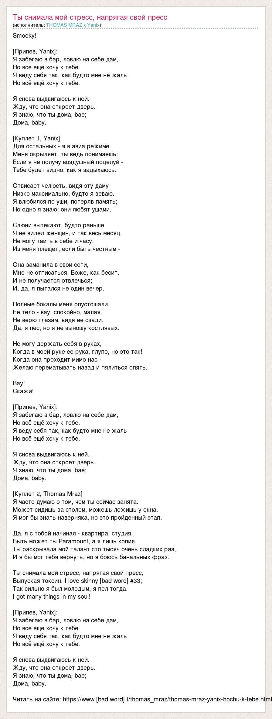Smooky! [Припев, Yanix]: Я забегаю в бар, ловлю на себе дам, Но всё ещё хочу к тебе. Я веду себя так, как будто мне не жаль Но всё ещё хочу к тебе. Я снова выдвигаюсь к ней. Жду, что она откроет дверь. Я знаю, что ты дома, bae; Дома, baby. [Куплет 1, Yanix] Для остальных - я в авиа режиме. Меня окрыляет, ты ведь понимаешь: Если я не получу воздушный поцелуй - Тебе будет видно, как я задыхаюсь. Отвисает челюсть, видя эту даму - Низко максимально, будто я зеваю. Я влюбился по уши, потеряв память; Но одно я знаю: они любят ушами. Слюни вытекают, будто раньше Я не видел женщин, и так весь месяц. Не могу таить в себе и часу. Из меня плещет, если быть честным - Она заманила в свои сети, Мне не отписаться. Боже, как бесит. И не получается отвлечься; И, да, я пытался не один вечер. Полные бокалы меня опустошали. Ее тело - вау, спокойно, малая. Не верю глазам, видя ее сзади. Да, я пес, но я не выношу костлявых. Не могу держать себя в руках, Когда в моей руке ее рука, глупо, но это так! Когда она проходит мимо нас - Желаю перематывать назад и пялиться опять. Вау! Скажи! [Припев, Yanix]: Я забегаю в бар, ловлю на себе дам, Но всё ещё хочу к тебе. Я веду себя так, как будто мне не жаль Но всё ещё хочу к тебе. Я снова выдвигаюсь к ней. Жду, что она откроет дверь. Я знаю, что ты дома, bae; Дома, baby. [Куплет 2, Thomas Mraz] Я часто думаю о том, чем ты сейчас занята. Может сидишь за столом, можешь лежишь у окна. Я мог бы знать наверняка, но это пройденный этап. Да, я с тобой начинал - квартира, студия. Быть может ты Paramount, а я лишь копия. Ты раскрывала мой талант сто тысяч очень сладких раз, И я бы мог тебя вернуть, но я боюсь банальных фраз. Ты снимала мой стресс, напрягая свой пресс, Выпуская токсин. I love skinny [bad word] #33; Так сильно я был молодым, я пел тогда. I got many things in my soul! [Припев, Yanix]: Я забегаю в бар, ловлю на себе дам, Но всё ещё хочу к тебе. Я веду себя так, как будто мне не жаль Но всё ещё хочу к тебе. Я снова выдвигаюсь к ней. Жду, что она откроет дверь. Я знаю, что ты дома, bae; Дома, baby. Читать на сайте: https://www [bad word] t/thomas_mraz/thomas-mraz-yanix-hochu-k-tebe.html