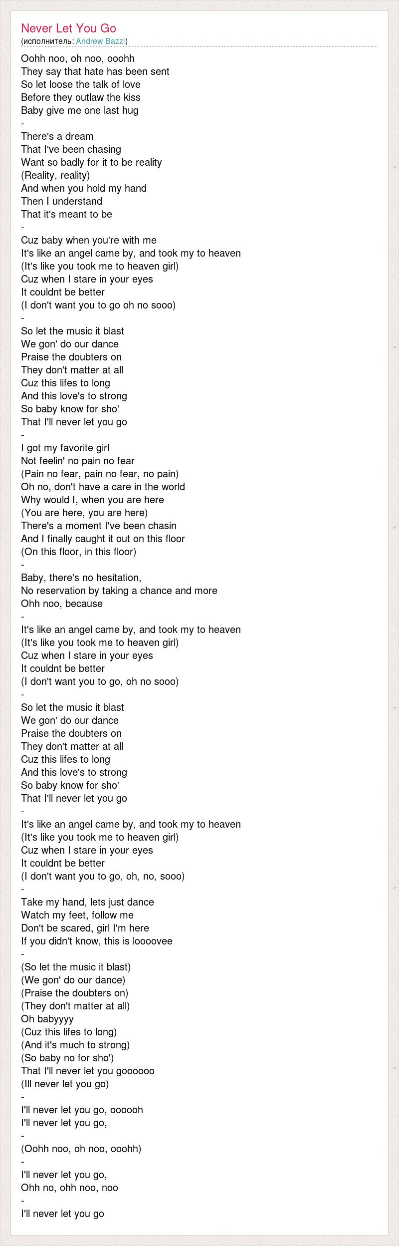 Oohh noo, oh noo, ooohh They say that hate has been sent So let loose the talk of love Before they outlaw the kiss Baby give me one last hug - There's a dream That I've been chasing Want so badly for it to be reality (Reality, reality) And when you hold my hand Then I understand That it's meant to be - Cuz baby when you're with me It's like an angel came by, and took my to heaven (It's like you took me to heaven girl) Cuz when I stare in your eyes It couldnt be better (I don't want you to go oh no sooo) - So let the music it blast We gon' do our dance Praise the doubters on They don't matter at all Cuz this lifes to long And this love's to strong So baby know for sho' That I'll never let you go - I got my favorite girl Not feelin' no pain no fear (Pain no fear, pain no fear, no pain) Oh no, don't have a care in the world Why would I, when you are here (You are here, you are here) There's a moment I've been chasin And I finally caught it out on this floor (On this floor, in this floor) - Baby, there's no hesitation, No reservation by taking a chance and more Ohh noo, because - It's like an angel came by, and took my to heaven (It's like you took me to heaven girl) Cuz when I stare in your eyes It couldnt be better (I don't want you to go, oh no sooo) - So let the music it blast We gon' do our dance Praise the doubters on They don't matter at all Cuz this lifes to long And this love's to strong So baby know for sho' That I'll never let you go - It's like an angel came by, and took my to heaven (It's like you took me to heaven girl) Cuz when I stare in your eyes It couldnt be better (I don't want you to go, oh, no, sooo) - Take my hand, lets just dance Watch my feet, follow me Don't be scared, girl I'm here If you didn't know, this is loooovee - (So let the music it blast) (We gon' do our dance) (Praise the doubters on) (They don't matter at all) Oh babyyyy (Cuz this lifes to long) (And it's much to strong) (So baby no for sho') That I'll never let you goooooo (Ill never let you go) - I'll never let you go, oooooh I'll never let you go, - (Oohh noo, oh noo, ooohh) - I'll never let you go, Ohh no, ohh noo, noo - I'll never let you go