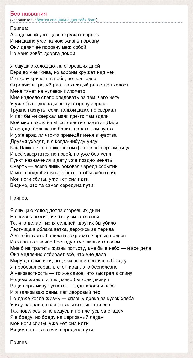 Припев: А надо мной уже давно кружат вороны И им давно уже на мою жизнь поровну Они делят её поровну меж собой Но меня зовёт дорога домой Я ощущаю холод дотла сгоревших дней Вера во мне жива, но вороны кружат над ней И я хочу кричать в небо, но сел голос Стреляю в третий раз, но каждый раз ствол холост Меня тянет на нулевой километр Мне надоело слепо следовать за тем, чего нету Я уже был однажды по ту сторону зеркал Трудно гаснуть, если толком даже не сверкал И как бы ни сверкал маяк где-то там вдали Мой мир похож на «Постоянство памяти» Дали И сердце больше не болит, просто там пусто И уже вряд ли что-то приведёт меня в чувства Друзья уходят, и я когда-нибудь уйду Как Пашка, что на школьном фото в четвёртом ряду И всё завертится по новой, но уже без меня Пункт назначения и дату уже поздно менять Смерть — всего лишь роковая череда событий И мне понадобится вечность, чтобы забыть их Мои ноги сбиты, уже нет сил идти Видимо, это та самая середина пути Припев. Я ощущаю холод дотла сгоревших дней Но жизнь бежит, и я бегу вместе с ней То, что делает меня сильней, других бы убило Лестница в облака ветха, держись за перила А мне бы взять белила и закрасить чёрные полосы И сказать спасибо Господу отчётливым голосом Мне б не тратить жизнь попусту, мне бы в небо — и все дела Она медленно отбирает всё, что мне дала Миру до лампочки, под чьи песни нестись в бездну Я пробовал сорвать стоп-кран, это бесполезно А неизвестность — то же самое, что выстрел в спину Родных жалко, а так давно бы кони двинул Ради пары минут успеха — годы крови и слёз И я зализываю раны, как дворовый пёс Но даже когда жизнь — сплошь драка за кусок хлеба Я иду направо, если остальных тянет влево Так повелось, я не ведусь и не плетусь за стадом Я в бреду, но бреду на церковный ладан Мои ноги сбиты, уже нет сил идти Видимо, это та самая середина пути Припев.