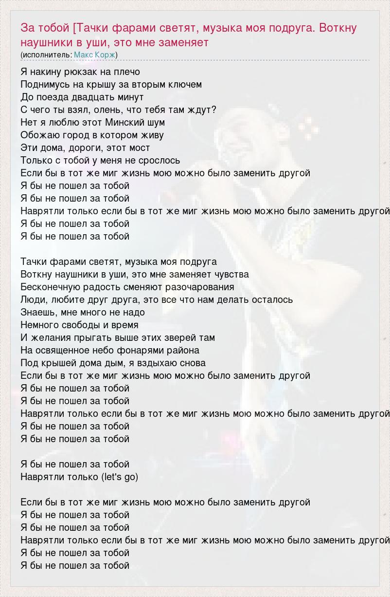 Я накину рюкзак на плечо Поднимусь на крышу за вторым ключем До поезда двадцать минут С чего ты взял, олень, что тебя там ждут? Нет я люблю этот Минский шум Обожаю город в котором живу Эти дома, дороги, этот мост Только с тобой у меня не срослось Если бы в тот же миг жизнь мою можно было заменить другой Я бы не пошел за тобой Я бы не пошел за тобой Наврятли только если бы в тот же миг жизнь мою можно было заменить другой Я бы не пошел за тобой Я бы не пошел за тобой Тачки фарами светят, музыка моя подруга Воткну наушники в уши, это мне заменяет чувства Бесконечную радость сменяют разочарования Люди, любите друг друга, это все что нам делать осталось Знаешь, мне много не надо Немного свободы и время И желания прыгать выше этих зверей там На освященное небо фонарями района Под крышей дома дым, я вздыхаю снова Если бы в тот же миг жизнь мою можно было заменить другой Я бы не пошел за тобой Я бы не пошел за тобой Наврятли только если бы в тот же миг жизнь мою можно было заменить другой Я бы не пошел за тобой Я бы не пошел за тобой Я бы не пошел за тобой Наврятли только (let's go) Если бы в тот же миг жизнь мою можно было заменить другой Я бы не пошел за тобой Я бы не пошел за тобой Наврятли только если бы в тот же миг жизнь мою можно было заменить другой Я бы не пошел за тобой Я бы не пошел за тобой