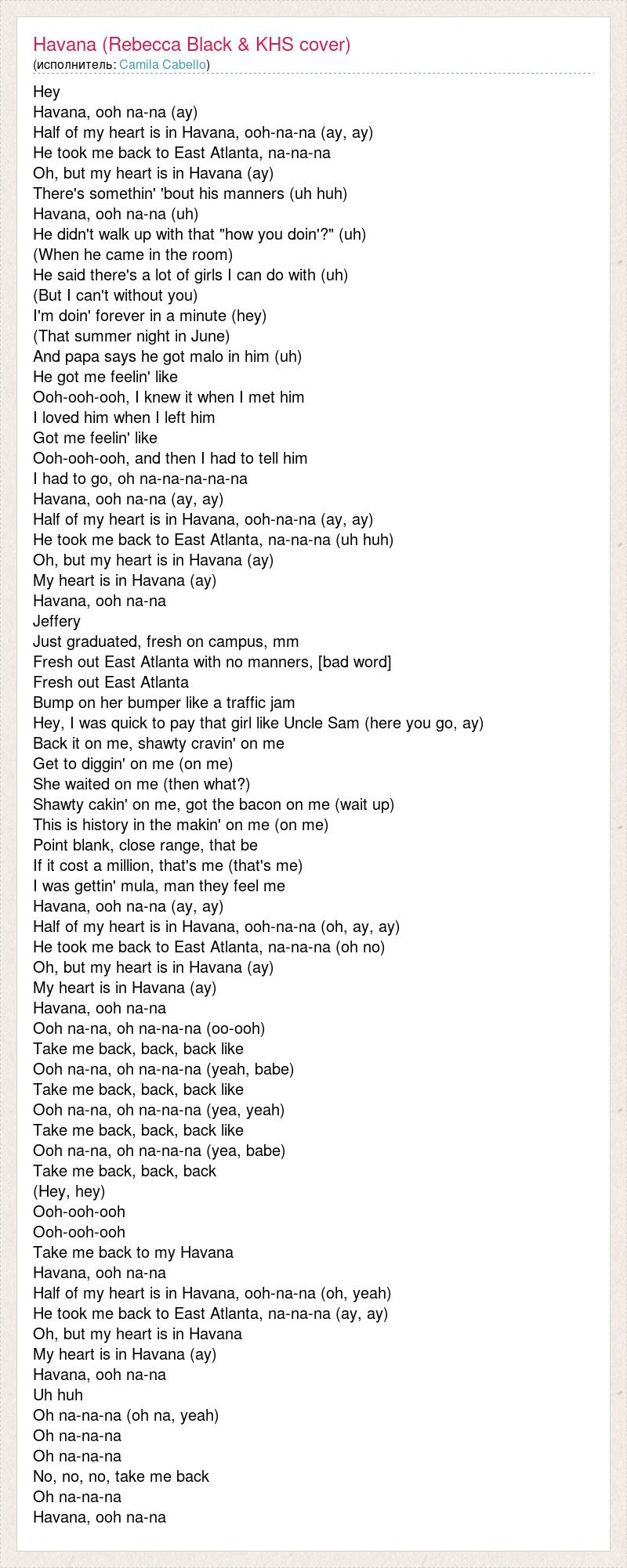 Hey Havana, ooh na-na (ay) Half of my heart is in Havana, ooh-na-na (ay, ay) He took me back to East Atlanta, na-na-na Oh, but my heart is in Havana (ay) There's somethin' 'bout his manners (uh huh) Havana, ooh na-na (uh) He didn't walk up with that "how you doin'?" (uh) (When he came in the room) He said there's a lot of girls I can do with (uh) (But I can't without you) I'm doin' forever in a minute (hey) (That summer night in June) And papa says he got malo in him (uh) He got me feelin' like Ooh-ooh-ooh, I knew it when I met him I loved him when I left him Got me feelin' like Ooh-ooh-ooh, and then I had to tell him I had to go, oh na-na-na-na-na Havana, ooh na-na (ay, ay) Half of my heart is in Havana, ooh-na-na (ay, ay) He took me back to East Atlanta, na-na-na (uh huh) Oh, but my heart is in Havana (ay) My heart is in Havana (ay) Havana, ooh na-na Jeffery Just graduated, fresh on campus, mm Fresh out East Atlanta with no manners, [bad word] Fresh out East Atlanta Bump on her bumper like a traffic jam Hey, I was quick to pay that girl like Uncle Sam (here you go, ay) Back it on me, shawty cravin' on me Get to diggin' on me (on me) She waited on me (then what?) Shawty cakin' on me, got the bacon on me (wait up) This is history in the makin' on me (on me) Point blank, close range, that be If it cost a million, that's me (that's me) I was gettin' mula, man they feel me Havana, ooh na-na (ay, ay) Half of my heart is in Havana, ooh-na-na (oh, ay, ay) He took me back to East Atlanta, na-na-na (oh no) Oh, but my heart is in Havana (ay) My heart is in Havana (ay) Havana, ooh na-na Ooh na-na, oh na-na-na (oo-ooh) Take me back, back, back like Ooh na-na, oh na-na-na (yeah, babe) Take me back, back, back like Ooh na-na, oh na-na-na (yea, yeah) Take me back, back, back like Ooh na-na, oh na-na-na (yea, babe) Take me back, back, back (Hey, hey) Ooh-ooh-ooh Ooh-ooh-ooh Take me back to my Havana Havana, ooh na-na Half of my heart is in Havana, ooh-na-na (oh, yeah) He took me back to East Atlanta, na-na-na (ay, ay) Oh, but my heart is in Havana My heart is in Havana (ay) Havana, ooh na-na Uh huh Oh na-na-na (oh na, yeah) Oh na-na-na Oh na-na-na No, no, no, take me back Oh na-na-na Havana, ooh na-na
