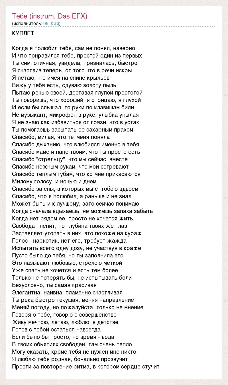 КУПЛЕТ Когда я полюбил тебя, сам не понял, наверно И что понравился тебе, простой один из первых Ты симпотичная, увидела, призналась, быстро Я счастлив теперь, от того что в речи искры Я летаю, не имея на спине крыльев Вижу у тебя есть, сдуваю золоту пыль Пытаю речью своей, доставая глупой простотой Ты говоришь, что хороший, я отрицаю, я глухой И если бы слышал, то руки по клавишам били Не музыкант, микрофон в руке, улыбка унылая Я не знаю как избавиться от грязи, что в устах Ты помогаешь засыпать ее сахарным прахом Спасибо, милая, что ты меня поняла Спасибо дыханию, что влюбился именно в тебя Спасибо маме и папе твоим, что ты просто есть Спасибо "стрельцу", что мы сейчас вместе Спасибо нежным рукам, что мои согревают Спасибо теплым губам, что ко мне прикасаются Милому голосу, и ночью и днем Спасибо за сны, в которых мы с тобою вдвоем Спасибо, что я полюбил, а раньше и не знал Может быть и к лучшему, зато сейчас понимаю Когда сначала вдыхаешь, не можешь запаха забыть Когда нет рядом ее, просто не хочется жить Свобода пленит, но глубина твоих же глаз Заставляет утопать в них, это похоже на кураж Голос - наркотик, нет его, требует жажда Испытать всего одну дозу, не участвуя в краже Пусто было до тебя, но ты заполнила это Это называют любовью, стрелою меткой Уже спать не хочется и есть тем более Только не потерять бы, не испытывать боли Безусловно, ты самая красивая Элегантна, наивна, пламенно счастливая Ты река быстро текущая, меняя направление Меняй погоду, но пожалуйста, только не мнение Говоря о тебе, говорю о совершенстве Живу мечтою, летаю, люблю, в детстве Готов с тобой остаться навсегда Если было бы просто, но время - вода В твоих обьятиях свободен, там очень тепло Могу сказать, кроме тебя не нужен мне никто Я люблю тебя родная, бонально прозвучит Прости за повторение ритма, в котором сердце стучит