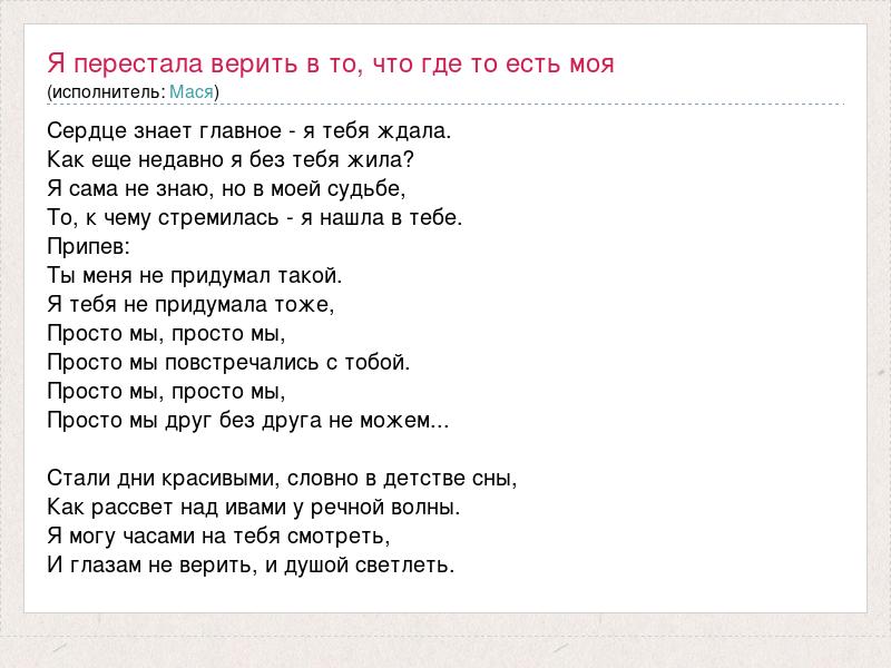Сердце знает главное - я тебя ждала. Как еще недавно я без тебя жила? Я сама не знаю, но в моей судьбе, То, к чему стремилась - я нашла в тебе. Припев: Ты меня не придумал такой. Я тебя не придумала тоже, Просто мы, просто мы, Просто мы повстречались с тобой. Просто мы, просто мы, Просто мы друг без друга не можем... Стали дни красивыми, словно в детстве сны, Как рассвет над ивами у речной волны. Я могу часами на тебя смотреть, И глазам не верить, и душой светлеть.