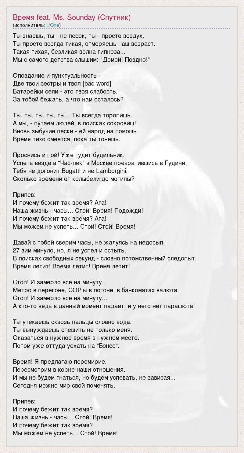 Ты знаешь, ты - не песок, ты - просто воздух. Ты просто всегда тикая, отмеряешь наш возраст. Такая тихая, безликая волна гипноза... Мы с самого детства слышим: "Домой! Поздно!" Опоздание и пунктуальность - Две твои сестры и твоя [bad word] Батарейки сели - это твоя слабость. За тобой бежать, а что нам осталось? Ты, ты, ты, ты, ты... Ты всегда торопишь. А мы, - путаем людей, в поисках сокровищ! Вновь зыбучие пески - ей народ на помощь. Время тихо смеется, пока ты тонешь. Проснись и пой! Уже гудит будильник. Успеть везде в "Час-пик" в Москве превратившись в Гудини. Тебя не догонит Bugatti и не Lamborgini. Сколько времени от колыбели до могилы? Припев: И почему бежит так время? Ага! Наша жизнь - часы... Стой! Время! Подожди! И почему бежит так время? Ага! Мы можем не успеть... Стой! Стой! Время! Давай с тобой сверим часы, не жалуясь на недосып. 27 зим минуло, но, я не успел и остыть. В поисках свободных секунд - словно потомственный следопыт. Время летит! Время летит! Время летит! Стоп! И замерло все на минуту... Метро в перегоне, COP'ы в погоне, в банкоматах валюта. Стоп! И замерло все на минуту... А кто-то ведь в данный момент падает, и у него нет парашюта! Ты утекаешь сквозь пальцы словно вода. Ты вынуждаешь спешить не только меня. Оказаться в нужное время в нужном месте. Потом уже оттуда уехать на "Бэнсе". Время! Я предлагаю перемирие. Пересмотрим в корне наши отношения. И мы не будем гнаться, но будем успевать, не зависая... Сегодня можно мир свой поменять. Припев: И почему бежит так время? Наша жизнь - часы... Стой! Время! И почему бежит так время? Мы можем не успеть... Стой! Время!