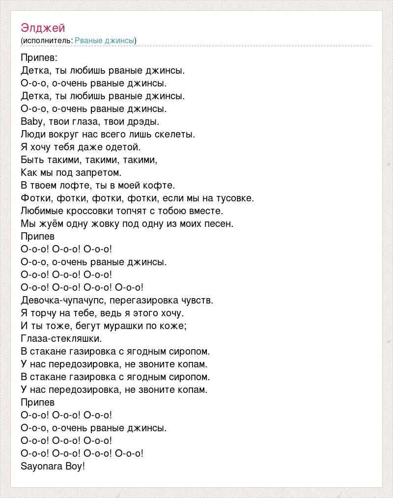Припев: Детка, ты любишь рваные джинсы. О-о-о, о-очень рваные джинсы. Детка, ты любишь рваные джинсы. О-о-о, о-очень рваные джинсы. Baby, твои глаза, твои дрэды. Люди вокруг нас всего лишь скелеты. Я хочу тебя даже одетой. Быть такими, такими, такими, Как мы под запретом. В твоем лофте, ты в моей кофте. Фотки, фотки, фотки, фотки, если мы на тусовке. Любимые кроссовки топчят с тобою вместе. Мы жуём одну жовку под одну из моих песен. Припев О-о-о! О-о-о! О-о-о! О-о-о, о-очень рваные джинсы. О-о-о! О-о-о! О-о-о! О-о-о! О-о-о! О-о-о! О-о-о! Девочка-чупачупс, перегазировка чувств. Я торчу на тебе, ведь я этого хочу. И ты тоже, бегут мурашки по коже; Глаза-стекляшки. В стакане газировка с ягодным сиропом. У нас передозировка, не звоните копам. В стакане газировка с ягодным сиропом. У нас передозировка, не звоните копам. Припев О-о-о! О-о-о! О-о-о! О-о-о, о-очень рваные джинсы. О-о-о! О-о-о! О-о-о! О-о-о! О-о-о! О-о-о! О-о-о! Sayonara Boy!