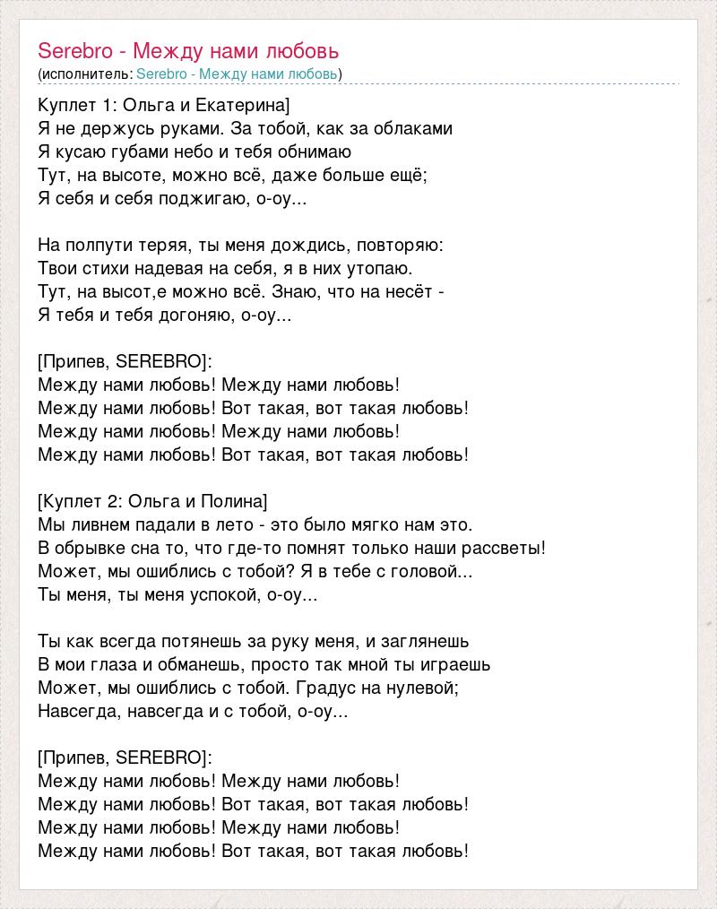 Куплет 1: Ольга и Екатерина] Я не держусь руками. За тобой, как за облаками Я кусаю губами небо и тебя обнимаю Тут, на высоте, можно всё, даже больше ещё; Я себя и себя поджигаю, о-оу... На полпути теряя, ты меня дождись, повторяю: Твои стихи надевая на себя, я в них утопаю. Тут, на высот,е можно всё. Знаю, что на несёт - Я тебя и тебя догоняю, о-оу... [Припев, SEREBRO]: Между нами любовь! Между нами любовь! Между нами любовь! Вот такая, вот такая любовь! Между нами любовь! Между нами любовь! Между нами любовь! Вот такая, вот такая любовь! [Куплет 2: Ольга и Полина] Мы ливнем падали в лето - это было мягко нам это. В обрывке сна то, что где-то помнят только наши рассветы! Может, мы ошиблись с тобой? Я в тебе с головой... Ты меня, ты меня успокой, о-оу... Ты как всегда потянешь за руку меня, и заглянешь В мои глаза и обманешь, просто так мной ты играешь Может, мы ошиблись с тобой. Градус на нулевой; Навсегда, навсегда и с тобой, о-оу... [Припев, SEREBRO]: Между нами любовь! Между нами любовь! Между нами любовь! Вот такая, вот такая любовь! Между нами любовь! Между нами любовь! Между нами любовь! Вот такая, вот такая любовь!