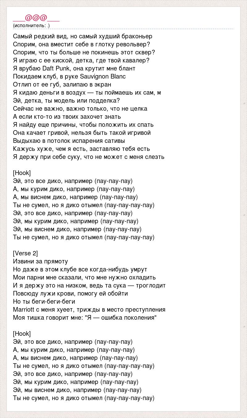 Самый редкий вид, но самый худший браконьер Спорим, она вместит себе в глотку револьвер? Спорим, что ты больше не покинешь этот сквер? Я играю с ее киской, детка, где твой кавалер? Я врубаю Daft Punk, она крутит мне блант Покидаем клуб, в руке Sauvignon Blanc Отлип от ее губ, залипаю в экран Я кидаю деньги в воздух — ты поймаешь их сам, м Эй, детка, ты модель или подделка? Сейчас не важно, важно только, что не целка А если кто-то из твоих захочет знать Я найду еще причины, чтобы положить их спать Она качает гривой, нельзя быть такой игривой Выдыхаю в потолок испарения сативы Кажусь хуже, чем я есть, заставляю тебя есть Я держу при себе суку, что не может с меня слезть [Hook] Эй, это все дико, например (пау-пау-пау) А, мы курим дико, например (пау-пау-пау) А, мы виснем дико, например (пау-пау-пау) Ты не сумел, но я дико отымел (пау-пау-пау-пау) Эй, это все дико, например (пау-пау-пау) Эй, мы курим дико, например (пау-пау-пау) Эй, мы виснем дико, например (пау-пау-пау) Ты не сумел, но я дико отымел (пау-пау-пау-пау) [Verse 2] Извини за прямоту Но даже в этом клубе все когда-нибудь умрут Мои парни мне сказали, что мне нужно охладить И я держу это на низком, ведь та сука — троглодит Повсюду лужи крови, помогу ей обойти Но ты беги-беги-беги Marriott с меня хуеет, трижды в место преступления Моя тишка говорит мне: "Я — ошибка поколения" [Hook] Эй, это все дико, например (пау-пау-пау) А, мы курим дико, например (пау-пау-пау) А, мы виснем дико, например (пау-пау-пау) Ты не сумел, но я дико отымел (пау-пау-пау-пау) Эй, это все дико, например (пау-пау-пау) Эй, мы курим дико, например (пау-пау-пау) Эй, мы виснем дико, например (пау-пау-пау) Ты не сумел, но я дико отымел (пау-пау-пау-пау)