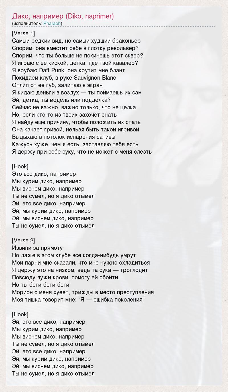 [Verse 1] Самый редкий вид, но самый худший браконьер Спорим, она вместит себе в глотку револьвер? Спорим, что ты больше не покинешь этот сквер? Я играю с ее киской, детка, где твой кавалер? Я врубаю Daft Punk, она крутит мне блант Покидаем клуб, в руке Sauvignon Blanc Отлип от ее губ, залипаю в экран Я кидаю деньги в воздух — ты поймаешь их сам Эй, детка, ты модель или подделка? Сейчас не важно, важно только, что не целка Но, если кто-то из твоих захочет знать Я найду еще причину, чтобы положить их спать Она качает гривой, нельзя быть такой игривой Выдыхаю в потолок испарения сативы Кажусь хуже, чем я есть, заставляю тебя есть Я держу при себе суку, что не может с меня слезть [Hook] Это все дико, например Мы курим дико, например Мы виснем дико, например Ты не сумел, но я дико отымел Эй, это все дико, например Эй, мы курим дико, например Эй, мы виснем дико, например Ты не сумел, но я дико отымел [Verse 2] Извини за прямоту Но даже в этом клубе все когда-нибудь умрут Мои парни мне сказали, что мне нужно охладиться Я держу это на низком, ведь та сука — троглодит Повсюду лужи крови, помогу ей обойти Но ты беги-беги-беги Морион с меня хуеет, трижды в место преступления Моя тишка говорит мне: "Я — ошибка поколения" [Hook] Эй, это все дико, например Мы курим дико, например Мы виснем дико, например Ты не сумел, но я дико отымел Эй, это все дико, например Эй, мы курим дико, например Эй, мы виснем дико, например Ты не сумел, но я дико отымел