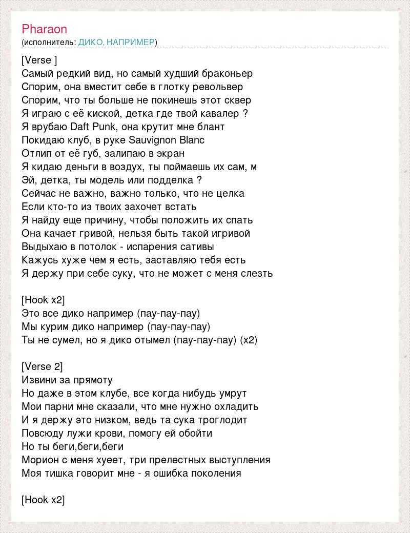 [Verse ] Самый редкий вид, но самый худший браконьер Спорим, она вместит себе в глотку револьвер Спорим, что ты больше не покинешь этот сквер Я играю с её киской, детка где твой кавалер ? Я врубаю Daft Punk, она крутит мне блант Покидаю клуб, в руке Sauvignon Blanc Отлип от её губ, залипаю в экран Я кидаю деньги в воздух, ты поймаешь их сам, м Эй, детка, ты модель или подделка ? Сейчас не важно, важно только, что не целка Если кто-то из твоих захочет встать Я найду еще причину, чтобы положить их спать Она качает гривой, нельзя быть такой игривой Выдыхаю в потолок - испарения сативы Кажусь хуже чем я есть, заставляю тебя есть Я держу при себе суку, что не может с меня слезть [Hook x2] Это все дико например (пау-пау-пау) Мы курим дико например (пау-пау-пау) Ты не сумел, но я дико отымел (пау-пау-пау) (x2) [Verse 2] Извини за прямоту Но даже в этом клубе, все когда нибудь умрут Мои парни мне сказали, что мне нужно охладить И я держу это низком, ведь та сука троглодит Повсюду лужи крови, помогу ей обойти Но ты беги,беги,беги Морион с меня хуеет, три прелестных выступления Моя тишка говорит мне - я ошибка поколения [Hook x2]