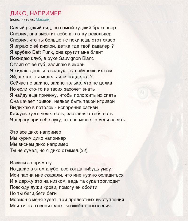 Самый редкий вид, но самый худший браконьер. Спорим, она вместит себе в глотку револьвер Спорим, что ты больше не покинешь этот сквер. Я играю с её киской, детка где твой кавалер ? Я врубаю Daft Punk, она крутит мне блант Покидаю клуб, в руке Sauvignon Blanc Отлип от её губ, залипаю в экран Я кидаю деньги в воздух, ты поймаешь их сам Эй, детка, ты модель или подделка ? Сейчас не важно, важно только, что не целка Но если кто-то из твоих захочет знать Я найду еще причину, чтобы положить их спать Она качает гривой, нельзя быть такой игривой Выдыхаю в потолок - испарения сативы Кажусь хуже чем я есть, заставляю тебя есть Я держу при себе суку, что не может с меня слезть. Это все дико например Мы курим дико например Мы виснем дико например Ты не сумел, но я дико отымел.(х2) Извини за прямоту Но даже в этом клубе, все когда нибудь умрут Мои парни мне сказали, что мне нужно охладиться И я держу это на низком, ведь та сука троглодит Повсюду лужи крови, помогу ей обойти Но ты беги,беги,беги Морион с меня хуеет, три прелестных выступления Моя тишка говорит мне - я ошибка поколения.