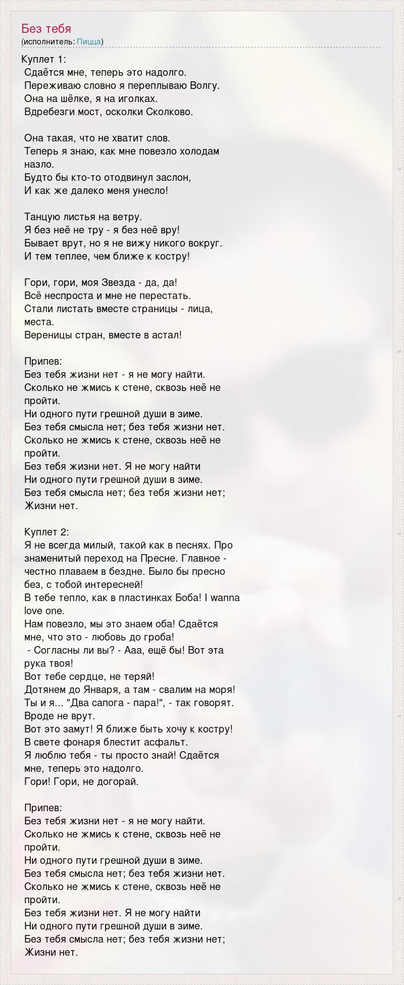 Куплет 1: Сдаётся мне, теперь это надолго. Переживаю словно я переплываю Волгу. Она на шёлке, я на иголках. Вдребезги мост, осколки Сколково. Она такая, что не хватит слов. Теперь я знаю, как мне повезло холодам назло. Будто бы кто-то отодвинул заслон, И как же далеко меня унесло! Танцую листья на ветру. Я без неё не тру - я без неё вру! Бывает врут, но я не вижу никого вокруг. И тем теплее, чем ближе к костру! Гори, гори, моя Звезда - да, да! Всё неспроста и мне не перестать. Стали листать вместе страницы - лица, места. Вереницы стран, вместе в астал! Припев: Без тебя жизни нет - я не могу найти. Сколько не жмись к стене, сквозь неё не пройти. Ни одного пути грешной души в зиме. Без тебя смысла нет; без тебя жизни нет. Сколько не жмись к стене, сквозь неё не пройти. Без тебя жизни нет. Я не могу найти Ни одного пути грешной души в зиме. Без тебя смысла нет; без тебя жизни нет; Жизни нет. Куплет 2: Я не всегда милый, такой как в песнях. Про знаменитый переход на Пресне. Главное - честно плаваем в бездне. Было бы пресно без, с тобой интересней! В тебе тепло, как в пластинках Боба! I wanna love one. Нам повезло, мы это знаем оба! Сдаётся мне, что это - любовь до гроба! - Согласны ли вы? - Ааа, ещё бы! Вот эта рука твоя! Вот тебе сердце, не теряй! Дотянем до Января, а там - свалим на моря! Ты и я... "Два сапога - пара!", - так говорят. Вроде не врут. Вот это замут! Я ближе быть хочу к костру! В свете фонаря блестит асфальт. Я люблю тебя - ты просто знай! Сдаётся мне, теперь это надолго. Гори! Гори, не догорай. Припев: Без тебя жизни нет - я не могу найти. Сколько не жмись к стене, сквозь неё не пройти. Ни одного пути грешной души в зиме. Без тебя смысла нет; без тебя жизни нет. Сколько не жмись к стене, сквозь неё не пройти. Без тебя жизни нет. Я не могу найти Ни одного пути грешной души в зиме. Без тебя смысла нет; без тебя жизни нет; Жизни нет.