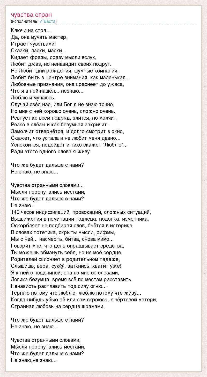 Ключи на стол... Да, она мучать мастер, Играет чувствами: Сказки, ласки, маски... Кидает фразы, сразу мысли вслух, Любит джаз, но ненавидит своих подруг. Не Любит дни рождения, шумные компании, Любит быть в центре внимания, как маленькая... Любовные признания, она краснеет до ужаса, Что я в ней нашёл... незнаю... Люблю и мучаюсь. Случай свёл нас, или Бог я не знаю точно, Но мне с ней хорошо очень, сложно очень. Ревнует ко всем подряд, злится, но молчит, Резко в слёзы и как безумная закричит. Замолчит отвернётся, и долго смотрит в окно, Скажет, что устала и не любит меня давно... Успокоится, подойдёт и тихо скажет "Люблю"... Ради этого одного слова я живу. Что же будет дальше с нами? Не знаю, не знаю... Чувства странными словами... Мысли перепутались местами, Что же будет дальше с нами? Не знаю... 140 часов индификаций, провокаций, сложных ситуаций, Выдвижения в номинации подлеца, подонка, изменника, Оскорбляет не подбирая слов, бьётся в истерике В словах потетика, скрыты мысли, рифмы, Мы с ней... насмерть, битва, снова мимо... Говорит мне, что цель оправдывает средства, Ты можешь обмануть себя, но не моё сердце. Родителей склоняет в родительном падеже, Слышишь, вера, сук@, заткнись, хватит уже! Я к ней с пощечиной, она ко мне со слезами, Логика безумца, время всё по местам расставить. Ненависть расплавить под силу огню... Терплю потому что люблю, люблю потому что живу... Когда-нибудь убью её или сам скроюсь, к чёртовой матери, Странная любовь на сердце шрамами. Что же будет дальше с нами? Не знаю, не знаю... Чувства странными словами, Мысли перепутались местами, Что же будет дальше с нами? Не знаю,не знаю...