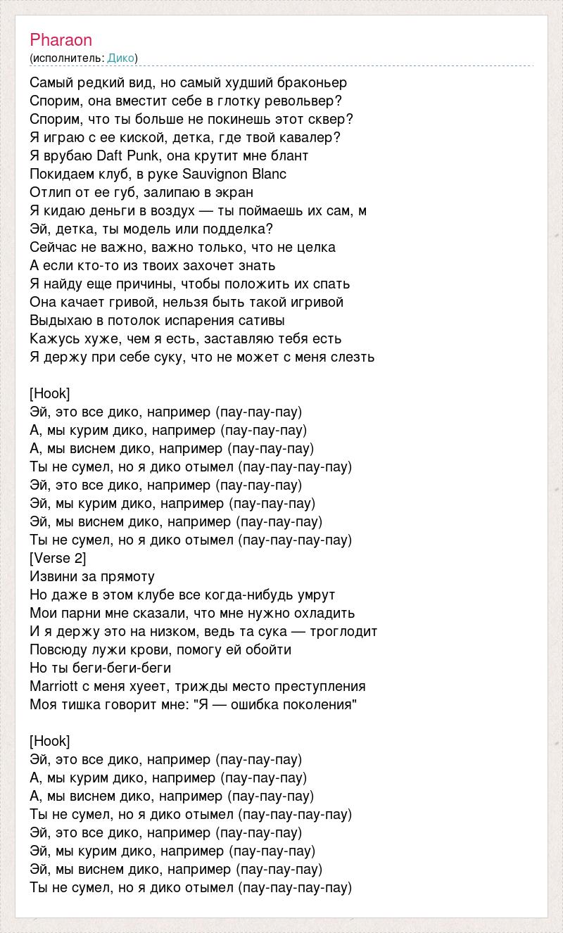 Самый редкий вид, но самый худший браконьер Спорим, она вместит себе в глотку револьвер? Спорим, что ты больше не покинешь этот сквер? Я играю с ее киской, детка, где твой кавалер? Я врубаю Daft Punk, она крутит мне блант Покидаем клуб, в руке Sauvignon Blanc Отлип от ее губ, залипаю в экран Я кидаю деньги в воздух — ты поймаешь их сам, м Эй, детка, ты модель или подделка? Сейчас не важно, важно только, что не целка А если кто-то из твоих захочет знать Я найду еще причины, чтобы положить их спать Она качает гривой, нельзя быть такой игривой Выдыхаю в потолок испарения сативы Кажусь хуже, чем я есть, заставляю тебя есть Я держу при себе суку, что не может с меня слезть [Hook] Эй, это все дико, например (пау-пау-пау) А, мы курим дико, например (пау-пау-пау) А, мы виснем дико, например (пау-пау-пау) Ты не сумел, но я дико отымел (пау-пау-пау-пау) Эй, это все дико, например (пау-пау-пау) Эй, мы курим дико, например (пау-пау-пау) Эй, мы виснем дико, например (пау-пау-пау) Ты не сумел, но я дико отымел (пау-пау-пау-пау) [Verse 2] Извини за прямоту Но даже в этом клубе все когда-нибудь умрут Мои парни мне сказали, что мне нужно охладить И я держу это на низком, ведь та сука — троглодит Повсюду лужи крови, помогу ей обойти Но ты беги-беги-беги Marriott с меня хуеет, трижды место преступления Моя тишка говорит мне: "Я — ошибка поколения" [Hook] Эй, это все дико, например (пау-пау-пау) А, мы курим дико, например (пау-пау-пау) А, мы виснем дико, например (пау-пау-пау) Ты не сумел, но я дико отымел (пау-пау-пау-пау) Эй, это все дико, например (пау-пау-пау) Эй, мы курим дико, например (пау-пау-пау) Эй, мы виснем дико, например (пау-пау-пау) Ты не сумел, но я дико отымел (пау-пау-пау-пау)