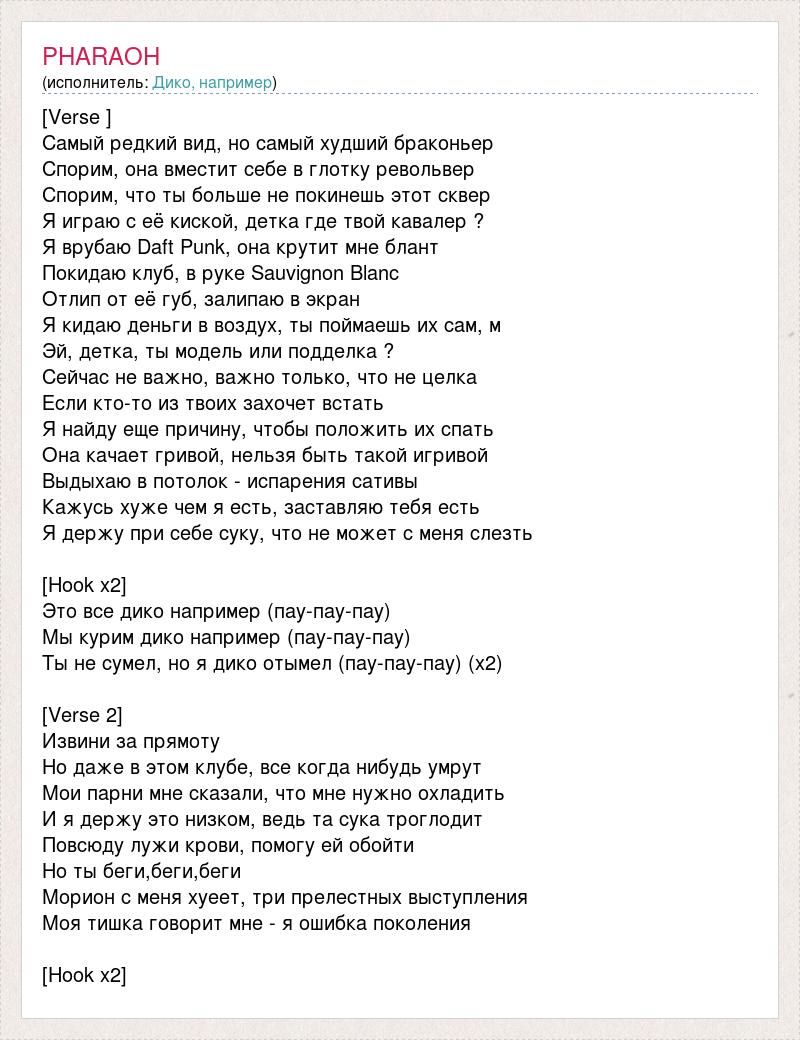 [Verse ] Самый редкий вид, но самый худший браконьер Спорим, она вместит себе в глотку револьвер Спорим, что ты больше не покинешь этот сквер Я играю с её киской, детка где твой кавалер ? Я врубаю Daft Punk, она крутит мне блант Покидаю клуб, в руке Sauvignon Blanc Отлип от её губ, залипаю в экран Я кидаю деньги в воздух, ты поймаешь их сам, м Эй, детка, ты модель или подделка ? Сейчас не важно, важно только, что не целка Если кто-то из твоих захочет встать Я найду еще причину, чтобы положить их спать Она качает гривой, нельзя быть такой игривой Выдыхаю в потолок - испарения сативы Кажусь хуже чем я есть, заставляю тебя есть Я держу при себе суку, что не может с меня слезть [Hook x2] Это все дико например (пау-пау-пау) Мы курим дико например (пау-пау-пау) Ты не сумел, но я дико отымел (пау-пау-пау) (x2) [Verse 2] Извини за прямоту Но даже в этом клубе, все когда нибудь умрут Мои парни мне сказали, что мне нужно охладить И я держу это низком, ведь та сука троглодит Повсюду лужи крови, помогу ей обойти Но ты беги,беги,беги Морион с меня хуеет, три прелестных выступления Моя тишка говорит мне - я ошибка поколения [Hook x2]