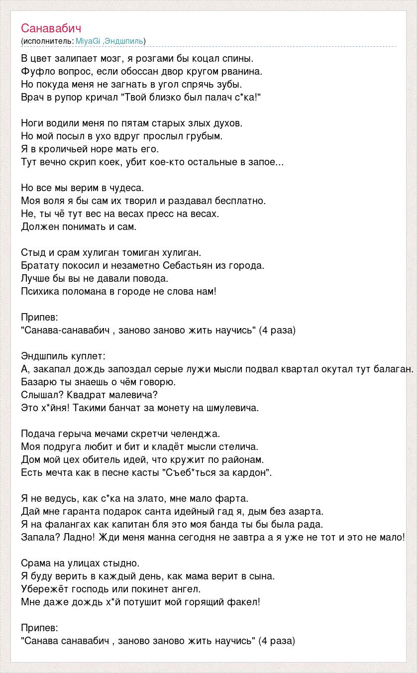 В цвет залипает мозг, я розгами бы коцал спины. Фуфло вопрос, если обоссан двор кругом рванина. Но покуда меня не загнать в угол спрячь зубы. Врач в рупор кричал "Твой близко был палач с*ка!" Ноги водили меня по пятам старых злых духов. Но мой посыл в ухо вдруг прослыл грубым. Я в кроличьей норе мать его. Тут вечно скрип коек, убит кое-кто остальные в запое... Но все мы верим в чудеса. Моя воля я бы сам их творил и раздавал бесплатно. Не, ты чё тут вес на весах пресс на весах. Должен понимать и сам. Стыд и срам хулиган томиган хулиган. Братату покосил и незаметно Себастьян из города. Лучше бы вы не давали повода. Психика поломана в городе не слова нам! Припев: "Санава-санавабич , заново заново жить научись" (4 раза) Эндшпиль куплет: А, закапал дождь запоздал серые лужи мысли подвал квартал окутал тут балаган. Базарю ты знаешь о чём говорю. Слышал? Квадрат малевича? Это х*йня! Такими банчат за монету на шмулевича. Подача герыча мечами скретчи челенджа. Моя подруга любит и бит и кладёт мысли стелича. Дом мой цех обитель идей, что кружит по районам. Есть мечта как в песне касты "Съеб*ться за кардон". Я не ведусь, как с*ка на злато, мне мало фарта. Дай мне гаранта подарок санта идейный гад я, дым без азарта. Я на фалангах как капитан бля это моя банда ты бы была рада. Запала? Ладно! Жди меня манна сегодня не завтра а я уже не тот и это не мало! Срама на улицах стыдно. Я буду верить в каждый день, как мама верит в сына. Убережёт господь или покинет ангел. Мне даже дождь х*й потушит мой горящий факел! Припев: "Санава санавабич , заново заново жить научись" (4 раза)