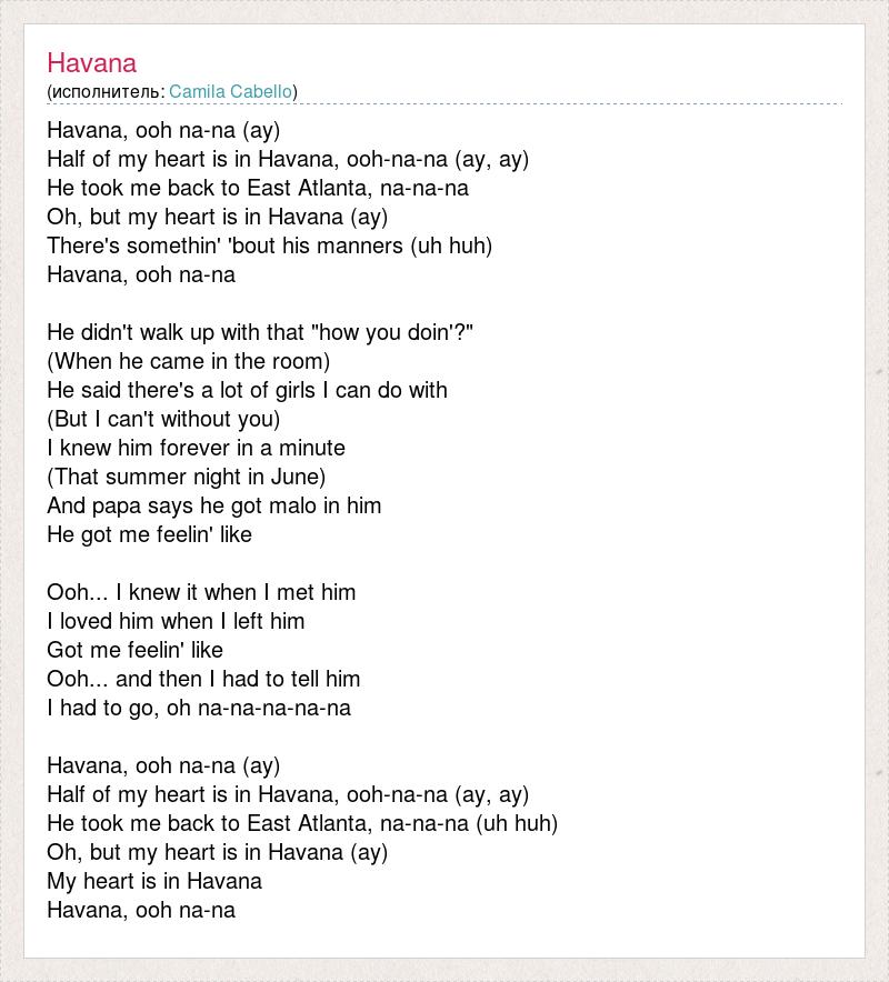Havana, ooh na-na (ay) Half of my heart is in Havana, ooh-na-na (ay, ay) He took me back to East Atlanta, na-na-na Oh, but my heart is in Havana (ay) There's somethin' 'bout his manners (uh huh) Havana, ooh na-na He didn't walk up with that "how you doin'?" (When he came in the room) He said there's a lot of girls I can do with (But I can't without you) I knew him forever in a minute (That summer night in June) And papa says he got malo in him He got me feelin' like Ooh... I knew it when I met him I loved him when I left him Got me feelin' like Ooh... and then I had to tell him I had to go, oh na-na-na-na-na Havana, ooh na-na (ay) Half of my heart is in Havana, ooh-na-na (ay, ay) He took me back to East Atlanta, na-na-na (uh huh) Oh, but my heart is in Havana (ay) My heart is in Havana Havana, ooh na-na