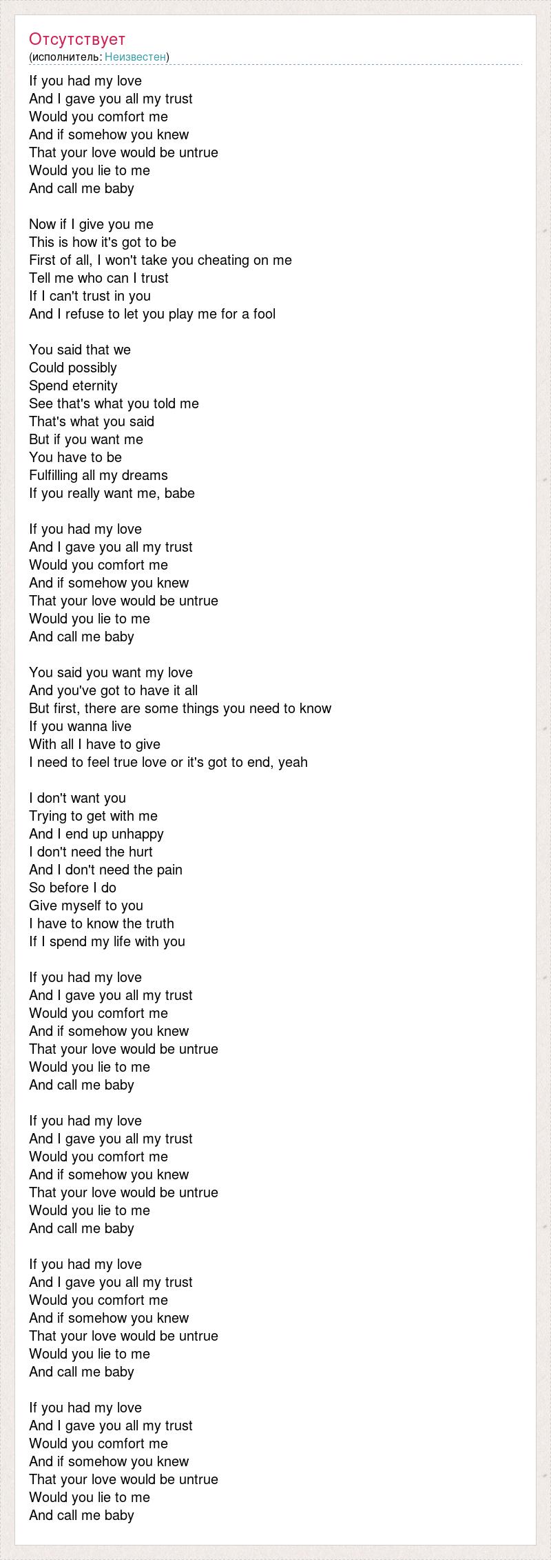 If you had my love And I gave you all my trust Would you comfort me And if somehow you knew That your love would be untrue Would you lie to me And call me baby Now if I give you me This is how it's got to be First of all, I won't take you cheating on me Tell me who can I trust If I can't trust in you And I refuse to let you play me for a fool You said that we Could possibly Spend eternity See that's what you told me That's what you said But if you want me You have to be Fulfilling all my dreams If you really want me, babe If you had my love And I gave you all my trust Would you comfort me And if somehow you knew That your love would be untrue Would you lie to me And call me baby You said you want my love And you've got to have it all But first, there are some things you need to know If you wanna live With all I have to give I need to feel true love or it's got to end, yeah I don't want you Trying to get with me And I end up unhappy I don't need the hurt And I don't need the pain So before I do Give myself to you I have to know the truth If I spend my life with you If you had my love And I gave you all my trust Would you comfort me And if somehow you knew That your love would be untrue Would you lie to me And call me baby If you had my love And I gave you all my trust Would you comfort me And if somehow you knew That your love would be untrue Would you lie to me And call me baby If you had my love And I gave you all my trust Would you comfort me And if somehow you knew That your love would be untrue Would you lie to me And call me baby If you had my love And I gave you all my trust Would you comfort me And if somehow you knew That your love would be untrue Would you lie to me And call me baby