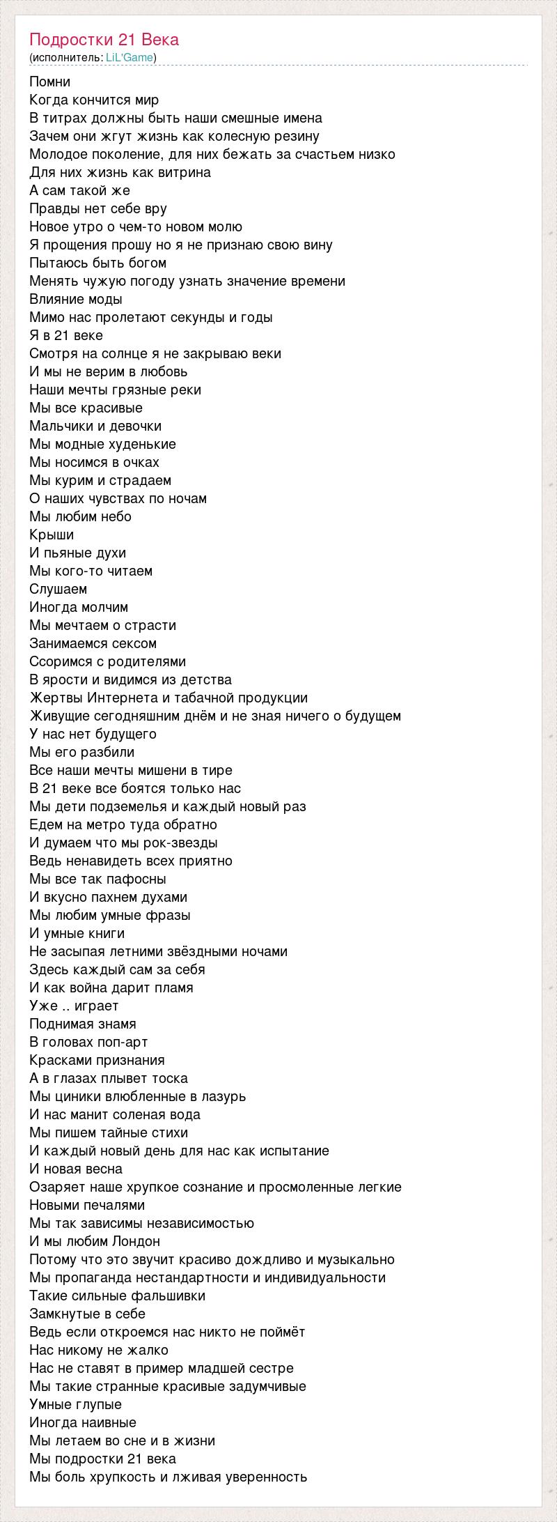 Помни Когда кончится мир В титрах должны быть наши смешные имена Зачем они жгут жизнь как колесную резину Молодое поколение, для них бежать за счастьем низко Для них жизнь как витрина А сам такой же Правды нет себе вру Новое утро о чем-то новом молю Я прощения прошу но я не признаю свою вину Пытаюсь быть богом Менять чужую погоду узнать значение времени Влияние моды Мимо нас пролетают секунды и годы Я в 21 веке Смотря на солнце я не закрываю веки И мы не верим в любовь Наши мечты грязные реки Мы все красивые Мальчики и девочки Мы модные худенькие Мы носимся в очках Мы курим и страдаем О наших чувствах по ночам Мы любим небо Крыши И пьяные духи Мы кого-то читаем Слушаем Иногда молчим Мы мечтаем о страсти Занимаемся сексом Ссоримся с родителями В ярости и видимся из детства Жертвы Интернета и табачной продукции Живущие сегодняшним днём и не зная ничего о будущем У нас нет будущего Мы его разбили Все наши мечты мишени в тире В 21 веке все боятся только нас Мы дети подземелья и каждый новый раз Едем на метро туда обратно И думаем что мы рок-звезды Ведь ненавидеть всех приятно Мы все так пафосны И вкусно пахнем духами Мы любим умные фразы И умные книги Не засыпая летними звёздными ночами Здесь каждый сам за себя И как война дарит пламя Уже .. играет Поднимая знамя В головах поп-арт Красками признания А в глазах плывет тоска Мы циники влюбленные в лазурь И нас манит соленая вода Мы пишем тайные стихи И каждый новый день для нас как испытание И новая весна Озаряет наше хрупкое сознание и просмоленные легкие Новыми печалями Мы так зависимы независимостью И мы любим Лондон Потому что это звучит красиво дождливо и музыкально Мы пропаганда нестандартности и индивидуальности Такие сильные фальшивки Замкнутые в себе Ведь если откроемся нас никто не поймёт Нас никому не жалко Нас не ставят в пример младшей сестре Мы такие странные красивые задумчивые Умные глупые Иногда наивные Мы летаем во сне и в жизни Мы подростки 21 века Мы боль хрупкость и лживая уверенность