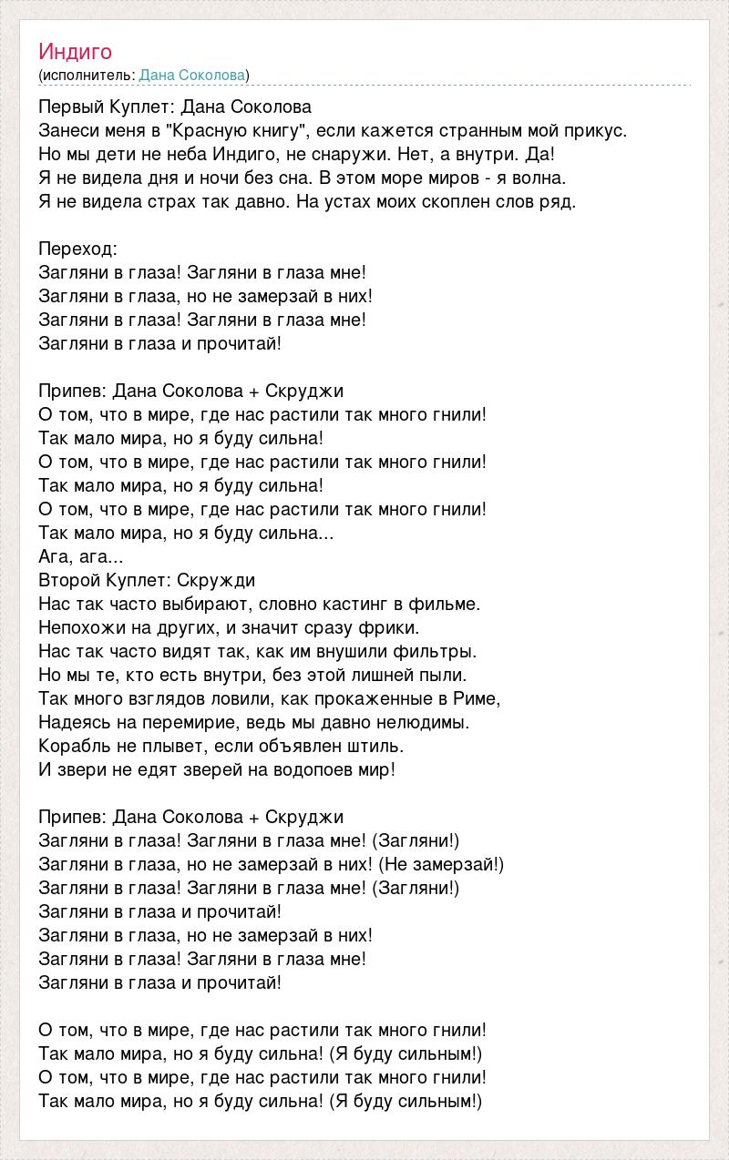 Первый Куплет: Дана Соколова Занеси меня в "Красную книгу", если кажется странным мой прикус. Но мы дети не неба Индиго, не снаружи. Нет, а внутри. Да! Я не видела дня и ночи без сна. В этом море миров - я волна. Я не видела страх так давно. На устах моих скоплен слов ряд. Переход: Загляни в глаза! Загляни в глаза мне! Загляни в глаза, но не замерзай в них! Загляни в глаза! Загляни в глаза мне! Загляни в глаза и прочитай! Припев: Дана Соколова + Скруджи О том, что в мире, где нас растили так много гнили! Так мало мира, но я буду сильна! О том, что в мире, где нас растили так много гнили! Так мало мира, но я буду сильна! О том, что в мире, где нас растили так много гнили! Так мало мира, но я буду сильна... Ага, ага... Второй Куплет: Скружди Нас так часто выбирают, словно кастинг в фильме. Непохожи на других, и значит сразу фрики. Нас так часто видят так, как им внушили фильтры. Но мы те, кто есть внутри, без этой лишней пыли. Так много взглядов ловили, как прокаженные в Риме, Надеясь на перемирие, ведь мы давно нелюдимы. Корабль не плывет, если объявлен штиль. И звери не едят зверей на водопоев мир! Припев: Дана Соколова + Скруджи Загляни в глаза! Загляни в глаза мне! (Загляни!) Загляни в глаза, но не замерзай в них! (Не замерзай!) Загляни в глаза! Загляни в глаза мне! (Загляни!) Загляни в глаза и прочитай! Загляни в глаза, но не замерзай в них! Загляни в глаза! Загляни в глаза мне! Загляни в глаза и прочитай! О том, что в мире, где нас растили так много гнили! Так мало мира, но я буду сильна! (Я буду сильным!) О том, что в мире, где нас растили так много гнили! Так мало мира, но я буду сильна! (Я буду сильным!)