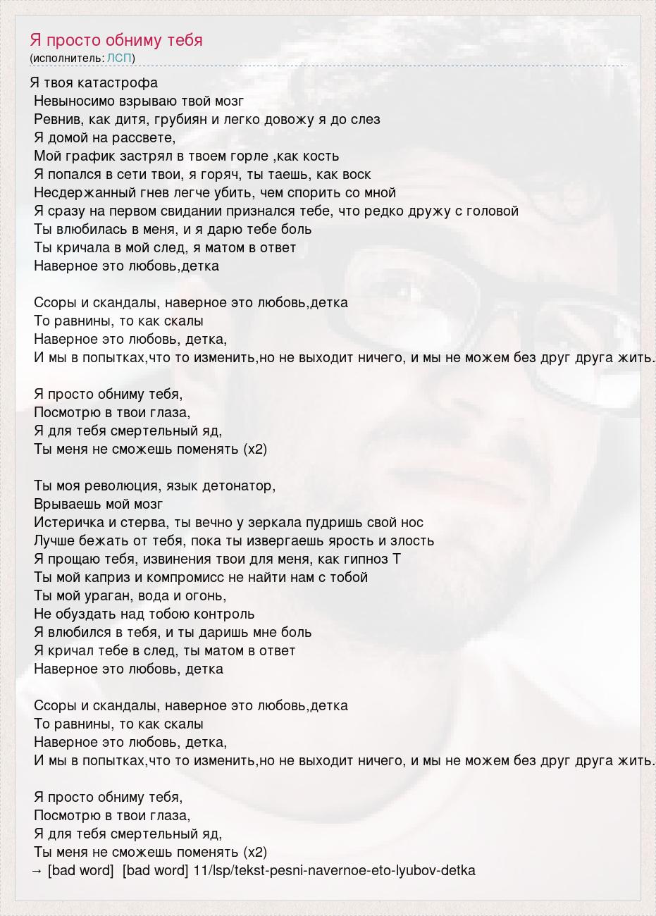 Я твоя катастрофа Невыносимо взрываю твой мозг Ревнив, как дитя, грубиян и легко довожу я до слез Я домой на рассвете, Мой график застрял в твоем горле ,как кость Я попался в сети твои, я горяч, ты таешь, как воск Несдержанный гнев легче убить, чем спорить со мной Я сразу на первом свидании признался тебе, что редко дружу с головой Ты влюбилась в меня, и я дарю тебе боль Ты кричала в мой след, я матом в ответ Наверное это любовь,детка Ссоры и скандалы, наверное это любовь,детка То равнины, то как скалы Наверное это любовь, детка, И мы в попытках,что то изменить,но не выходит ничего, и мы не можем без друг друга жить. Я просто обниму тебя, Посмотрю в твои глаза, Я для тебя смертельный яд, Ты меня не сможешь поменять (х2) Ты моя революция, язык детонатор, Врываешь мой мозг Истеричка и стерва, ты вечно у зеркала пудришь свой нос Лучше бежать от тебя, пока ты извергаешь ярость и злость Я прощаю тебя, извинения твои для меня, как гипноз Т Ты мой каприз и компромисс не найти нам с тобой Ты мой ураган, вода и огонь, Не обуздать над тобою контроль Я влюбился в тебя, и ты даришь мне боль Я кричал тебе в след, ты матом в ответ Наверное это любовь, детка Ссоры и скандалы, наверное это любовь,детка То равнины, то как скалы Наверное это любовь, детка, И мы в попытках,что то изменить,но не выходит ничего, и мы не можем без друг друга жить. Я просто обниму тебя, Посмотрю в твои глаза, Я для тебя смертельный яд, Ты меня не сможешь поменять (х2) → [bad word] [bad word] 11/lsp/tekst-pesni-navernoe-eto-lyubov-detka