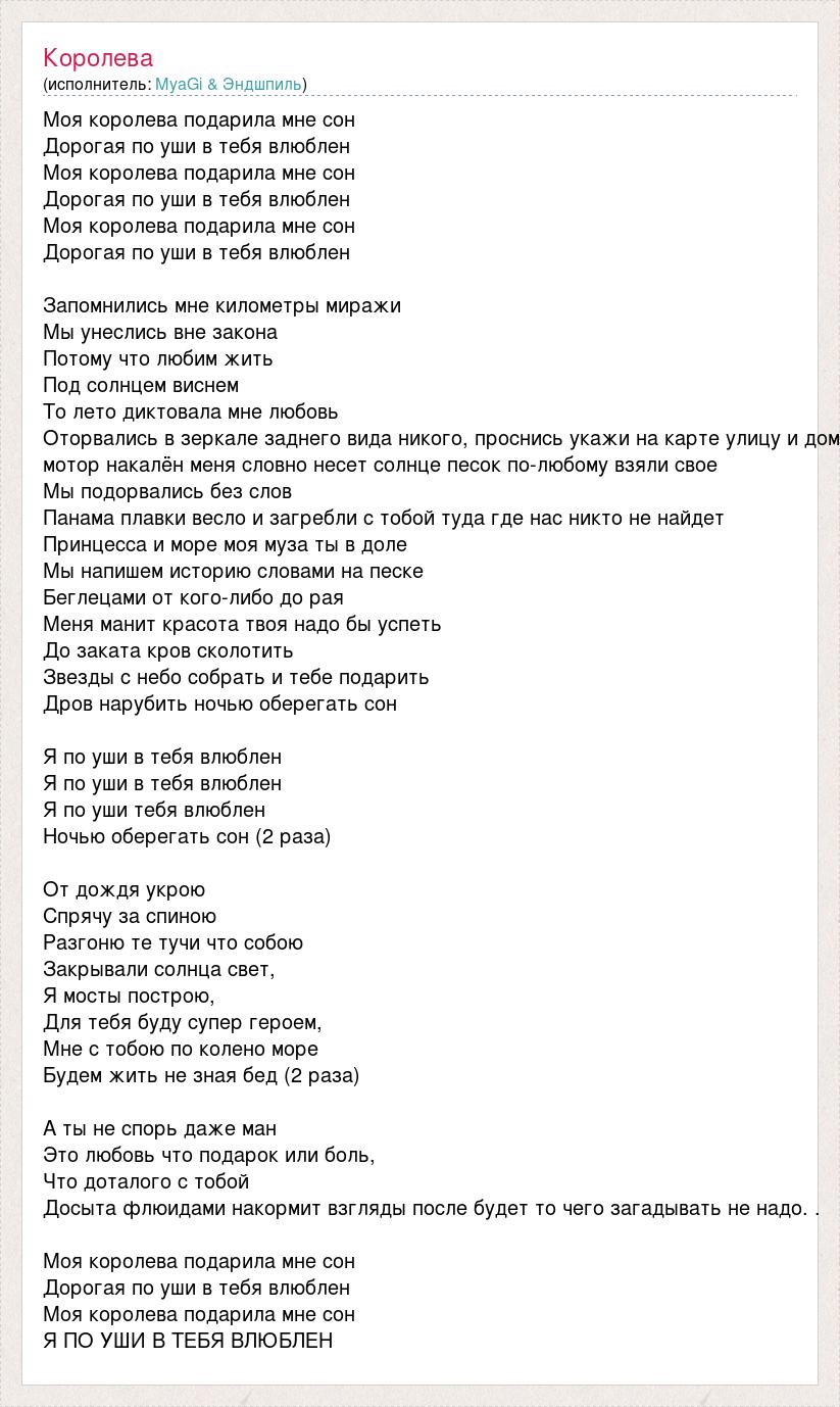 Моя королева подарила мне сон Дорогая по уши в тебя влюблен Моя королева подарила мне сон Дорогая по уши в тебя влюблен Моя королева подарила мне сон Дорогая по уши в тебя влюблен Запомнились мне километры миражи Мы унеслись вне закона Потому что любим жить Под солнцем виснем То лето диктовала мне любовь Оторвались в зеркале заднего вида никого, проснись укажи на карте улицу и дом мотор накалён меня словно несет солнце песок по-любому взяли свое Мы подорвались без слов Панама плавки весло и загребли с тобой туда где нас никто не найдет Принцесса и море моя муза ты в доле Мы напишем историю словами на песке Беглецами от кого-либо до рая Меня манит красота твоя надо бы успеть До заката кров сколотить Звезды с небо собрать и тебе подарить Дров нарубить ночью оберегать сон Я по уши в тебя влюблен Я по уши в тебя влюблен Я по уши тебя влюблен Ночью оберегать сон (2 раза) От дождя укрою Спрячу за спиною Разгоню те тучи что собою Закрывали солнца свет, Я мосты построю, Для тебя буду супер героем, Мне с тобою по колено море Будем жить не зная бед (2 раза) А ты не спорь даже ман Это любовь что подарок или боль, Что доталого с тобой Досыта флюидами накормит взгляды после будет то чего загадывать не надо. . Моя королева подарила мне сон Дорогая по уши в тебя влюблен Моя королева подарила мне сон Я ПО УШИ В ТЕБЯ ВЛЮБЛЕН