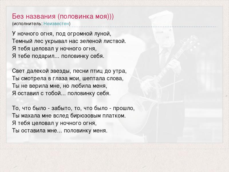 У ночного огня, под огромной луной, Темный лес укрывал нас зеленой листвой. Я тебя целовал у ночного огня, Я тебе подарил... половинку себя. Свет далекой звезды, песни птиц до утра, Ты смотрела в глаза мои, шептала слова, Ты не верила мне, но любила меня, Я оставил с тобой... половинку себя. То, что было - забыто, то, что было - прошло, Ты махала мне вслед бирюзовым платком. Я тебя целовал у ночного огня, Ты оставила мне... половинку меня.