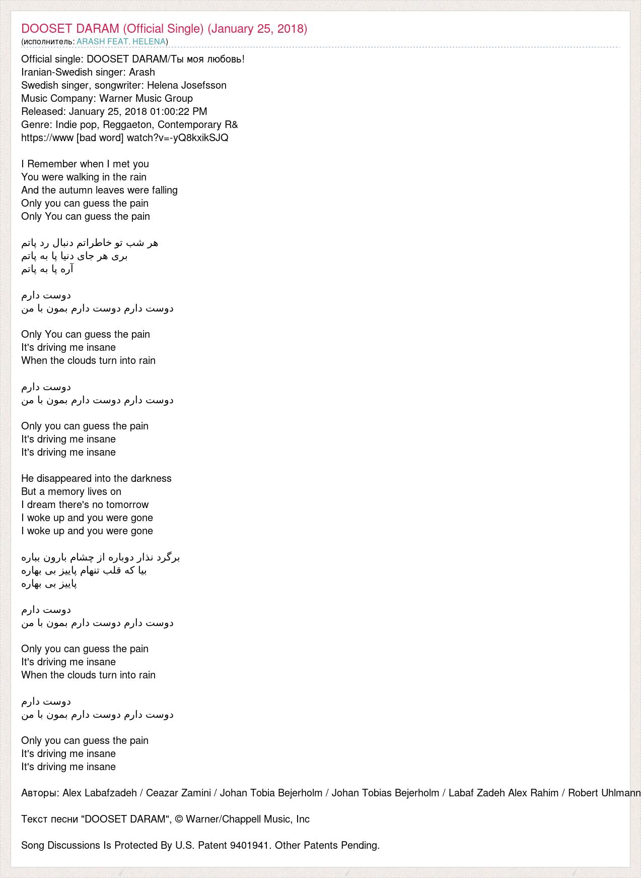 Official single: DOOSET DARAM/Ты моя любовь! Iranian-Swedish singer: Arash Swedish singer, songwriter: Helena Josefsson Music Company: Warner Music Group Released: January 25, 2018 01:00:22 PM Genre: Indie pop, Reggaeton, Contemporary R& https://www [bad word] watch?v=-yQ8kxikSJQ I Remember when I met you You were walking in the rain And the autumn leaves were falling Only you can guess the pain Only You can guess the pain هر شب تو خاطراتم دنبال رد پاتم بری هر جای دنیا پا به پاتم آره پا به پاتم دوست دارم دوست دارم دوست دارم بمون با من Only You can guess the pain It's driving me insane When the clouds turn into rain دوست دارم دوست دارم دوست دارم بمون با من Only you can guess the pain It's driving me insane It's driving me insane He disappeared into the darkness But a memory lives on I dream there's no tomorrow I woke up and you were gone I woke up and you were gone برگرد نذار دوباره از چشام بارون بباره بیا که قلب تنهام پاییز بی بهاره پاییز بی بهاره دوست دارم دوست دارم دوست دارم بمون با من Only you can guess the pain It's driving me insane When the clouds turn into rain دوست دارم دوست دارم دوست دارم بمون با من Only you can guess the pain It's driving me insane It's driving me insane Авторы: Alex Labafzadeh / Ceazar Zamini / Johan Tobia Bejerholm / Johan Tobias Bejerholm / Labaf Zadeh Alex Rahim / Robert Uhlmann Текст песни "DOOSET DARAM", © Warner/Chappell Music, Inc Song Discussions Is Protected By U.S. Patent 9401941. Other Patents Pending.
