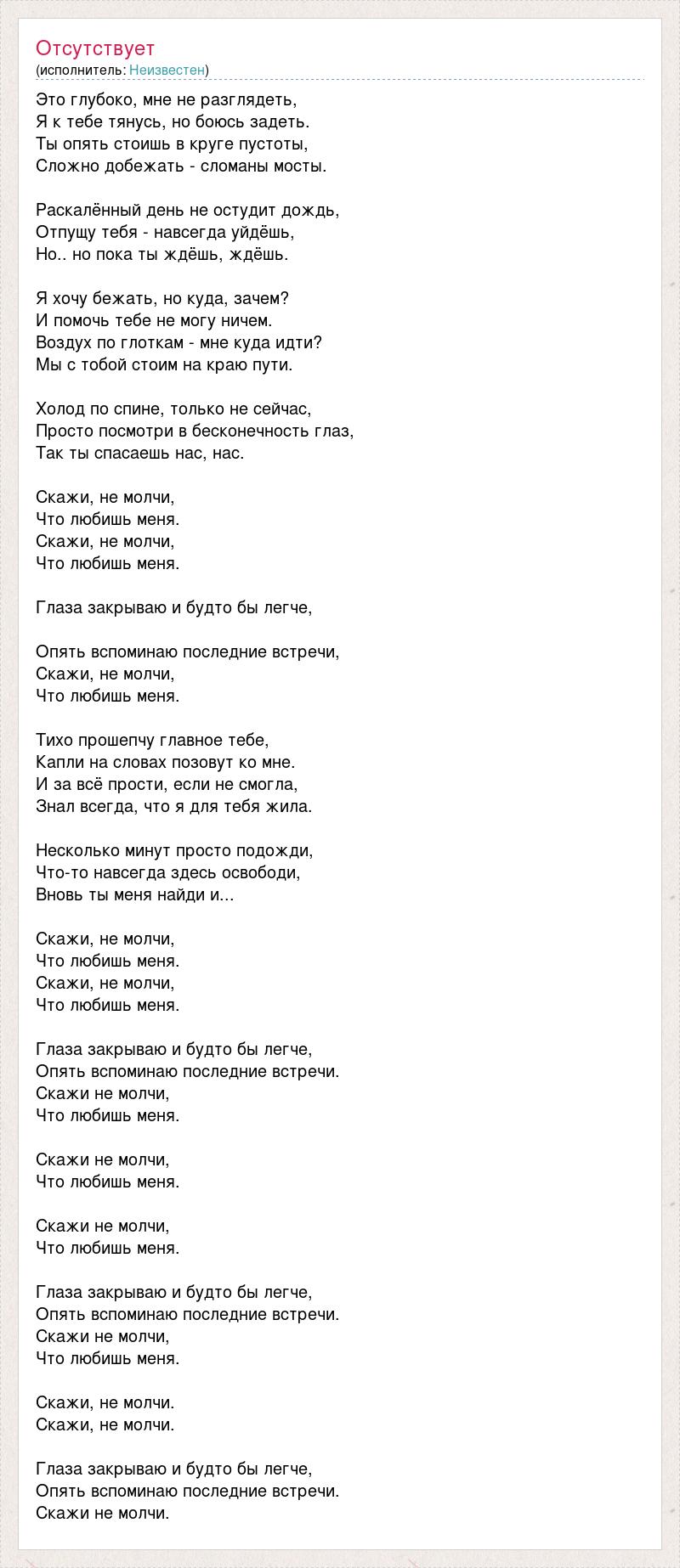 Это глубоко, мне не разглядеть, Я к тебе тянусь, но боюсь задеть. Ты опять стоишь в круге пустоты, Сложно добежать - сломаны мосты. Раскалённый день не остудит дождь, Отпущу тебя - навсегда уйдёшь, Но.. но пока ты ждёшь, ждёшь. Я хочу бежать, но куда, зачем? И помочь тебе не могу ничем. Воздух по глоткам - мне куда идти? Мы с тобой стоим на краю пути. Холод по спине, только не сейчас, Просто посмотри в бесконечность глаз, Так ты спасаешь нас, нас. Скажи, не молчи, Что любишь меня. Скажи, не молчи, Что любишь меня. Глаза закрываю и будто бы легче, Опять вспоминаю последние встречи, Скажи, не молчи, Что любишь меня. Тихо прошепчу главное тебе, Капли на словах позовут ко мне. И за всё прости, если не смогла, Знал всегда, что я для тебя жила. Несколько минут просто подожди, Что-то навсегда здесь освободи, Вновь ты меня найди и... Скажи, не молчи, Что любишь меня. Скажи, не молчи, Что любишь меня. Глаза закрываю и будто бы легче, Опять вспоминаю последние встречи. Скажи не молчи, Что любишь меня. Скажи не молчи, Что любишь меня. Скажи не молчи, Что любишь меня. Глаза закрываю и будто бы легче, Опять вспоминаю последние встречи. Скажи не молчи, Что любишь меня. Скажи, не молчи. Скажи, не молчи. Глаза закрываю и будто бы легче, Опять вспоминаю последние встречи. Скажи не молчи.