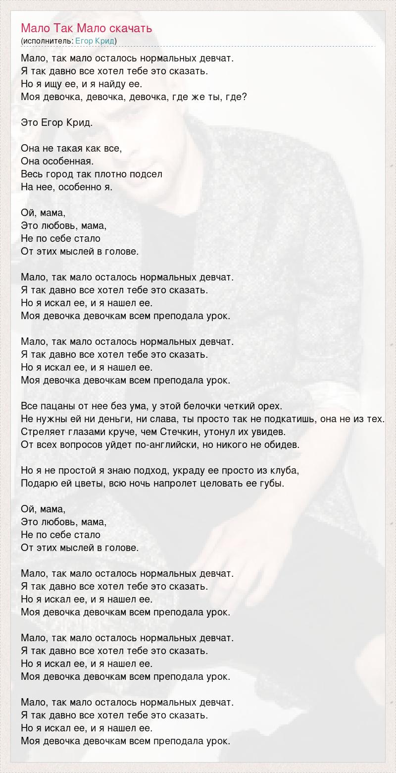 Мало, так мало осталось нормальных девчат. Я так давно все хотел тебе это сказать. Но я ищу ее, и я найду ее. Моя девочка, девочка, девочка, где же ты, где? Это Егор Крид. Она не такая как все, Она особенная. Весь город так плотно подсел На нее, особенно я. Ой, мама, Это любовь, мама, Не по себе стало От этих мыслей в голове. Мало, так мало осталось нормальных девчат. Я так давно все хотел тебе это сказать. Но я искал ее, и я нашел ее. Моя девочка девочкам всем преподала урок. Мало, так мало осталось нормальных девчат. Я так давно все хотел тебе это сказать. Но я искал ее, и я нашел ее. Моя девочка девочкам всем преподала урок. Все пацаны от нее без ума, у этой белочки четкий орех. Не нужны ей ни деньги, ни слава, ты просто так не подкатишь, она не из тех. Стреляет глазами круче, чем Стечкин, утонул их увидев. От всех вопросов уйдет по-английски, но никого не обидев. Но я не простой я знаю подход, украду ее просто из клуба, Подарю ей цветы, всю ночь напролет целовать ее губы. Ой, мама, Это любовь, мама, Не по себе стало От этих мыслей в голове. Мало, так мало осталось нормальных девчат. Я так давно все хотел тебе это сказать. Но я искал ее, и я нашел ее. Моя девочка девочкам всем преподала урок. Мало, так мало осталось нормальных девчат. Я так давно все хотел тебе это сказать. Но я искал ее, и я нашел ее. Моя девочка девочкам всем преподала урок. Мало, так мало осталось нормальных девчат. Я так давно все хотел тебе это сказать. Но я искал ее, и я нашел ее. Моя девочка девочкам всем преподала урок.