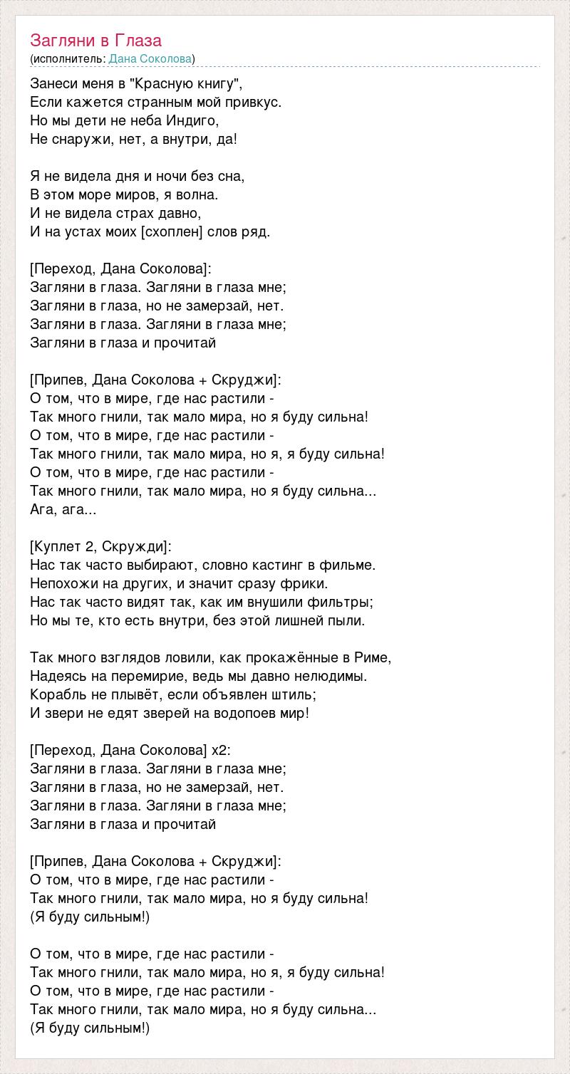 Занеси меня в "Красную книгу", Если кажется странным мой привкус. Но мы дети не неба Индиго, Не снаружи, нет, а внутри, да! Я не видела дня и ночи без сна, В этом море миров, я волна. И не видела страх давно, И на устах моих [схоплен] слов ряд. [Переход, Дана Соколова]: Загляни в глаза. Загляни в глаза мне; Загляни в глаза, но не замерзай, нет. Загляни в глаза. Загляни в глаза мне; Загляни в глаза и прочитай [Припев, Дана Соколова + Скруджи]: О том, что в мире, где нас растили - Так много гнили, так мало мира, но я буду сильна! О том, что в мире, где нас растили - Так много гнили, так мало мира, но я, я буду сильна! О том, что в мире, где нас растили - Так много гнили, так мало мира, но я буду сильна... Ага, ага... [Куплет 2, Скружди]: Нас так часто выбирают, словно кастинг в фильме. Непохожи на других, и значит сразу фрики. Нас так часто видят так, как им внушили фильтры; Но мы те, кто есть внутри, без этой лишней пыли. Так много взглядов ловили, как прокажённые в Риме, Надеясь на перемирие, ведь мы давно нелюдимы. Корабль не плывёт, если объявлен штиль; И звери не едят зверей на водопоев мир! [Переход, Дана Соколова] x2: Загляни в глаза. Загляни в глаза мне; Загляни в глаза, но не замерзай, нет. Загляни в глаза. Загляни в глаза мне; Загляни в глаза и прочитай [Припев, Дана Соколова + Скруджи]: О том, что в мире, где нас растили - Так много гнили, так мало мира, но я буду сильна! (Я буду сильным!) О том, что в мире, где нас растили - Так много гнили, так мало мира, но я, я буду сильна! О том, что в мире, где нас растили - Так много гнили, так мало мира, но я буду сильна... (Я буду сильным!)