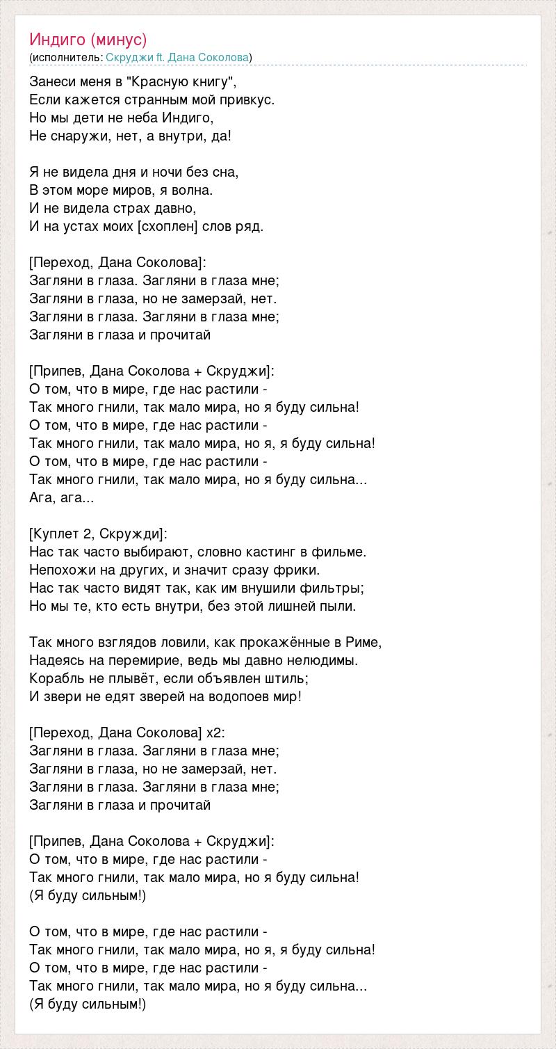 Занеси меня в "Красную книгу", Если кажется странным мой привкус. Но мы дети не неба Индиго, Не снаружи, нет, а внутри, да! Я не видела дня и ночи без сна, В этом море миров, я волна. И не видела страх давно, И на устах моих [схоплен] слов ряд. [Переход, Дана Соколова]: Загляни в глаза. Загляни в глаза мне; Загляни в глаза, но не замерзай, нет. Загляни в глаза. Загляни в глаза мне; Загляни в глаза и прочитай [Припев, Дана Соколова + Скруджи]: О том, что в мире, где нас растили - Так много гнили, так мало мира, но я буду сильна! О том, что в мире, где нас растили - Так много гнили, так мало мира, но я, я буду сильна! О том, что в мире, где нас растили - Так много гнили, так мало мира, но я буду сильна... Ага, ага... [Куплет 2, Скружди]: Нас так часто выбирают, словно кастинг в фильме. Непохожи на других, и значит сразу фрики. Нас так часто видят так, как им внушили фильтры; Но мы те, кто есть внутри, без этой лишней пыли. Так много взглядов ловили, как прокажённые в Риме, Надеясь на перемирие, ведь мы давно нелюдимы. Корабль не плывёт, если объявлен штиль; И звери не едят зверей на водопоев мир! [Переход, Дана Соколова] x2: Загляни в глаза. Загляни в глаза мне; Загляни в глаза, но не замерзай, нет. Загляни в глаза. Загляни в глаза мне; Загляни в глаза и прочитай [Припев, Дана Соколова + Скруджи]: О том, что в мире, где нас растили - Так много гнили, так мало мира, но я буду сильна! (Я буду сильным!) О том, что в мире, где нас растили - Так много гнили, так мало мира, но я, я буду сильна! О том, что в мире, где нас растили - Так много гнили, так мало мира, но я буду сильна... (Я буду сильным!)