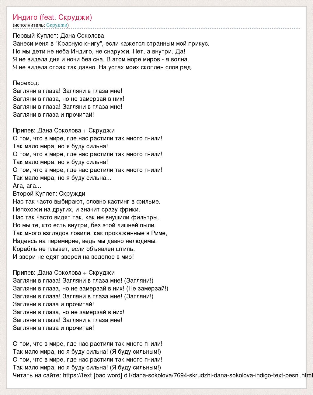Первый Куплет: Дана Соколова Занеси меня в "Красную книгу", если кажется странным мой прикус. Но мы дети не неба Индиго, не снаружи. Нет, а внутри. Да! Я не видела дня и ночи без сна. В этом море миров - я волна. Я не видела страх так давно. На устах моих скоплен слов ряд. Переход: Загляни в глаза! Загляни в глаза мне! Загляни в глаза, но не замерзай в них! Загляни в глаза! Загляни в глаза мне! Загляни в глаза и прочитай! Припев: Дана Соколова + Скруджи О том, что в мире, где нас растили так много гнили! Так мало мира, но я буду сильна! О том, что в мире, где нас растили так много гнили! Так мало мира, но я буду сильна! О том, что в мире, где нас растили так много гнили! Так мало мира, но я буду сильна... Ага, ага... Второй Куплет: Скружди Нас так часто выбирают, словно кастинг в фильме. Непохожи на других, и значит сразу фрики. Нас так часто видят так, как им внушили фильтры. Но мы те, кто есть внутри, без этой лишней пыли. Так много взглядов ловили, как прокаженные в Риме, Надеясь на перемирие, ведь мы давно нелюдимы. Корабль не плывет, если объявлен штиль. И звери не едят зверей на водопое в мир! Припев: Дана Соколова + Скруджи Загляни в глаза! Загляни в глаза мне! (Загляни!) Загляни в глаза, но не замерзай в них! (Не замерзай!) Загляни в глаза! Загляни в глаза мне! (Загляни!) Загляни в глаза и прочитай! Загляни в глаза, но не замерзай в них! Загляни в глаза! Загляни в глаза мне! Загляни в глаза и прочитай! О том, что в мире, где нас растили так много гнили! Так мало мира, но я буду сильна! (Я буду сильным!) О том, что в мире, где нас растили так много гнили! Так мало мира, но я буду сильна! (Я буду сильным!) Читать на сайте: https://text [bad word] d1/dana-sokolova/7694-skrudzhi-dana-sokolova-indigo-text-pesni.html