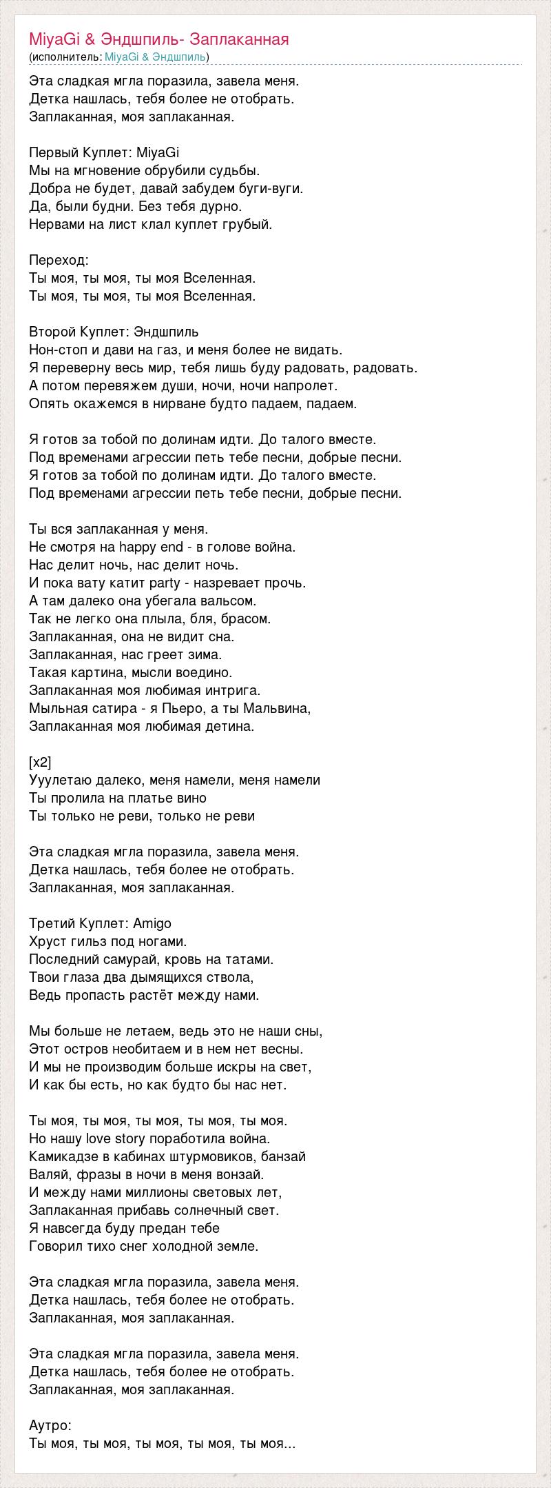 Эта сладкая мгла поразила, завела меня. Детка нашлась, тебя более не отобрать. Заплаканная, моя заплаканная. Первый Куплет: MiyaGi Мы на мгновение обрубили судьбы. Добра не будет, давай забудем буги-вуги. Да, были будни. Без тебя дурно. Нервами на лист клал куплет грубый. Переход: Ты моя, ты моя, ты моя Вселенная. Ты моя, ты моя, ты моя Вселенная. Второй Куплет: Эндшпиль Нон-стоп и дави на газ, и меня более не видать. Я переверну весь мир, тебя лишь буду радовать, радовать. А потом перевяжем души, ночи, ночи напролет. Опять окажемся в нирване будто падаем, падаем. Я готов за тобой по долинам идти. До талого вместе. Под временами агрессии петь тебе песни, добрые песни. Я готов за тобой по долинам идти. До талого вместе. Под временами агрессии петь тебе песни, добрые песни. Ты вся заплаканная у меня. Не смотря на happy end - в голове война. Нас делит ночь, нас делит ночь. И пока вату катит party - назревает прочь. А там далеко она убегала вальсом. Так не легко она плыла, бля, брасом. Заплаканная, она не видит сна. Заплаканная, нас греет зима. Такая картина, мысли воедино. Заплаканная моя любимая интрига. Мыльная сатира - я Пьеро, а ты Мальвина, Заплаканная моя любимая детина. [x2] Ууулетаю далеко, меня намели, меня намели Ты пролила на платье вино Ты только не реви, только не реви Эта сладкая мгла поразила, завела меня. Детка нашлась, тебя более не отобрать. Заплаканная, моя заплаканная. Третий Куплет: Amigo Хруст гильз под ногами. Последний самурай, кровь на татами. Твои глаза два дымящихся ствола, Ведь пропасть растёт между нами. Мы больше не летаем, ведь это не наши сны, Этот остров необитаем и в нем нет весны. И мы не производим больше искры на свет, И как бы есть, но как будто бы нас нет. Ты моя, ты моя, ты моя, ты моя, ты моя. Но нашу love story поработила война. Камикадзе в кабинах штурмовиков, банзай Валяй, фразы в ночи в меня вонзай. И между нами миллионы световых лет, Заплаканная прибавь солнечный свет. Я навсегда буду предан тебе Говорил тихо снег холодной земле. Эта сладкая мгла поразила, завела меня. Детка нашлась, тебя более не отобрать. Заплаканная, моя заплаканная. Эта сладкая мгла поразила, завела меня. Детка нашлась, тебя более не отобрать. Заплаканная, моя заплаканная. Аутро: Ты моя, ты моя, ты моя, ты моя, ты моя...