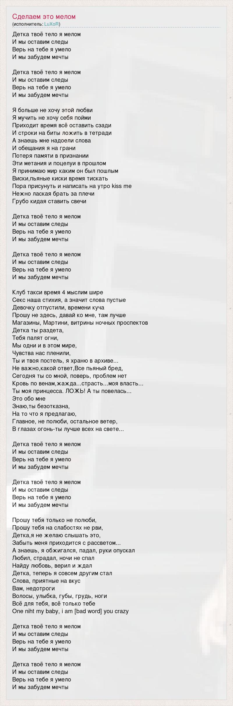 Детка твоё тело я мелом И мы оставим следы Верь на тебе я умело И мы забудем мечты Детка твоё тело я мелом И мы оставим следы Верь на тебе я умело И мы забудем мечты Я больше не хочу этой любви Я мучить не хочу себя пойми Приходит время всё оставить сзади И строки на биты ложить в тетради А знаешь мне надоели слова И обещания я на грани Потеря памяти в признании Эти метания и поцелуи в прошлом Я принимаю мир каким он был пошлым Виски,пьяные киски время тискать Пора присунуть и написать на утро kiss me Нежно лаская брать за плечи Грубо кидая ставить свечи Детка твоё тело я мелом И мы оставим следы Верь на тебе я умело И мы забудем мечты Детка твоё тело я мелом И мы оставим следы Верь на тебе я умело И мы забудем мечты Клуб такси время 4 мыслим шире Секс наша стихия, а значит слова пустые Девочку отпустили, времени куча Прошу не здесь, давай ко мне, там лучше Магазины, Мартини, витрины ночных проспектов Детка ты раздета, Тебя палят огни, Мы одни и в этом мире, Чувства нас пленили, Ты и твоя постель, я храню в архиве... Не важно,какой ответ,Все пьяный бред, Сегодня ты со мной, поверь, проблем нет Кровь по венам,жажда...страсть...моя власть... Ты моя принцесса. ЛОЖЬ! А ты повелась... Это обо мне Знаю,ты безотказна, На то что я предлагаю, Главное, не полюби, остальное ветер, В глазах огонь-ты лучше всех на свете... Детка твоё тело я мелом И мы оставим следы Верь на тебе я умело И мы забудем мечты Детка твоё тело я мелом И мы оставим следы Верь на тебе я умело И мы забудем мечты Прошу тебя только не полюби, Прошу тебя на слабостях не рви, Детка,я не желаю слышать это, Забыть меня приходится с рассветом... А знаешь, я обжигался, падал, руки опускал Любил, страдал, ночи не спал Найду любовь, верил и ждал Детка, теперь я совсем другим стал Слова, приятные на вкус Вам, недотроги Волосы, улыбка, губы, грудь, ноги Всё для тебя, всё только тебе One niht my baby, i am [bad word] you crazy Детка твоё тело я мелом И мы оставим следы Верь на тебе я умело И мы забудем мечты Детка твоё тело я мелом И мы оставим следы Верь на тебе я умело И мы забудем мечты