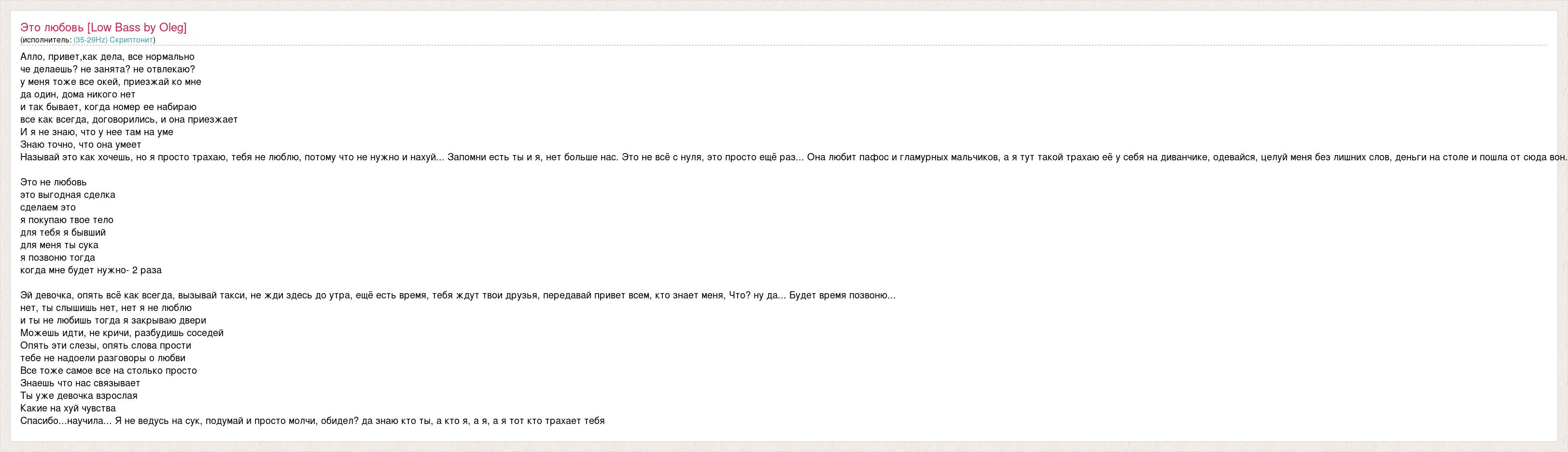 Алло, привет,как дела, все нормально че делаешь? не занята? не отвлекаю? у меня тоже все окей, приезжай ко мне да один, дома никого нет и так бывает, когда номер ее набираю все как всегда, договорились, и она приезжает И я не знаю, что у нее там на уме Знаю точно, что она умеет Называй это как хочешь, но я просто трахаю, тебя не люблю, потому что не нужно и нахуй... Запомни есть ты и я, нет больше нас. Это не всё с нуля, это просто ещё раз... Она любит пафос и гламурных мальчиков, а я тут такой трахаю её у себя на диванчике, одевайся, целуй меня без лишних слов, деньги на столе и пошла от сюда вон. Это не любовь это выгодная сделка сделаем это я покупаю твое тело для тебя я бывший для меня ты сука я позвоню тогда когда мне будет нужно- 2 раза Эй девочка, опять всё как всегда, вызывай такси, не жди здесь до утра, ещё есть время, тебя ждут твои друзья, передавай привет всем, кто знает меня, Что? ну да... Будет время позвоню... нет, ты слышишь нет, нет я не люблю и ты не любишь тогда я закрываю двери Можешь идти, не кричи, разбудишь соседей Опять эти слезы, опять слова прости тебе не надоели разговоры о любви Все тоже самое все на столько просто Знаешь что нас связывает Ты уже девочка взрослая Какие на хуй чувства Спасибо...научила... Я не ведусь на сук, подумай и просто молчи, обидел? да знаю кто ты, а кто я, а я, а я тот кто трахает тебя