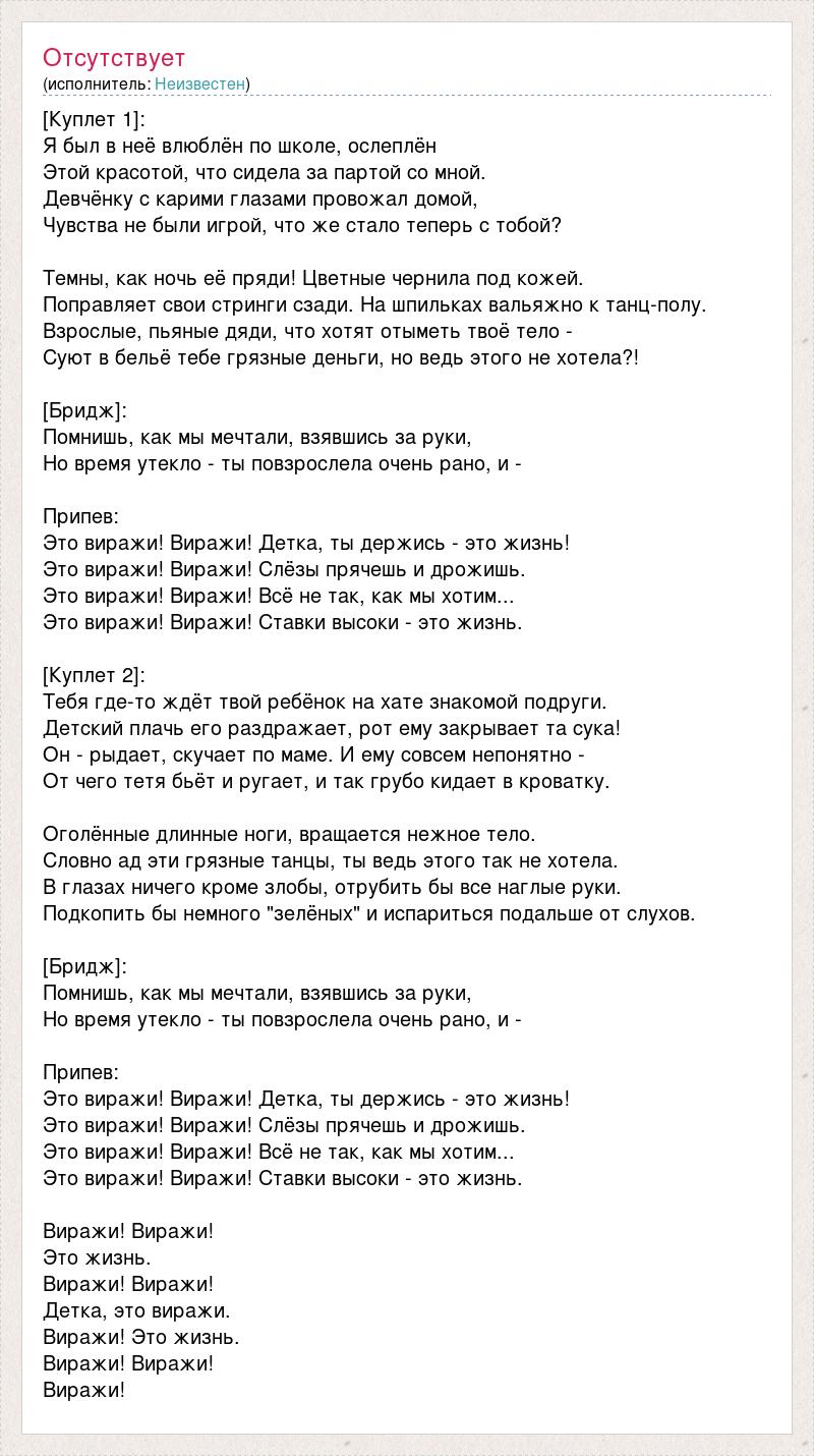 [Куплет 1]: Я был в неё влюблён по школе, ослеплён Этой красотой, что сидела за партой со мной. Девчёнку с карими глазами провожал домой, Чувства не были игрой, что же стало теперь с тобой? Темны, как ночь её пряди! Цветные чернила под кожей. Поправляет свои стринги сзади. На шпильках вальяжно к танц-полу. Взрослые, пьяные дяди, что хотят отыметь твоё тело - Суют в бельё тебе грязные деньги, но ведь этого не хотела?! [Бридж]: Помнишь, как мы мечтали, взявшись за руки, Но время утекло - ты повзрослела очень рано, и - Припев: Это виражи! Виражи! Детка, ты держись - это жизнь! Это виражи! Виражи! Слёзы прячешь и дрожишь. Это виражи! Виражи! Всё не так, как мы хотим... Это виражи! Виражи! Ставки высоки - это жизнь. [Куплет 2]: Тебя где-то ждёт твой ребёнок на хате знакомой подруги. Детский плачь его раздражает, рот ему закрывает та сука! Он - рыдает, скучает по маме. И ему совсем непонятно - От чего тетя бьёт и ругает, и так грубо кидает в кроватку. Оголённые длинные ноги, вращается нежное тело. Словно ад эти грязные танцы, ты ведь этого так не хотела. В глазах ничего кроме злобы, отрубить бы все наглые руки. Подкопить бы немного "зелёных" и испариться подальше от слухов. [Бридж]: Помнишь, как мы мечтали, взявшись за руки, Но время утекло - ты повзрослела очень рано, и - Припев: Это виражи! Виражи! Детка, ты держись - это жизнь! Это виражи! Виражи! Слёзы прячешь и дрожишь. Это виражи! Виражи! Всё не так, как мы хотим... Это виражи! Виражи! Ставки высоки - это жизнь. Виражи! Виражи! Это жизнь. Виражи! Виражи! Детка, это виражи. Виражи! Это жизнь. Виражи! Виражи! Виражи!