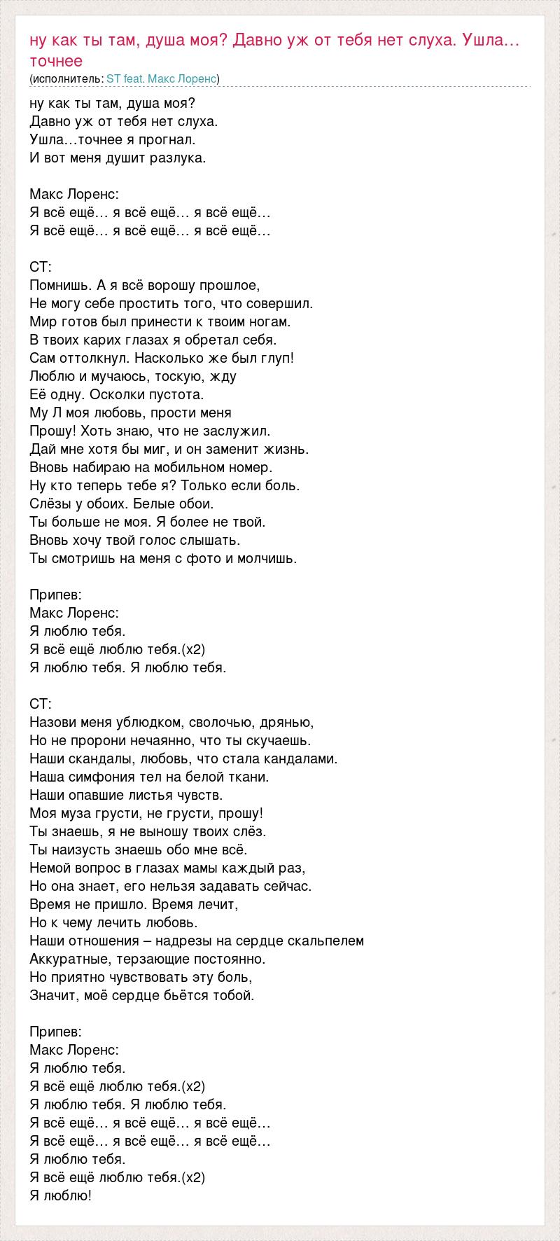 ну как ты там, душа моя? Давно уж от тебя нет слуха. Ушла…точнее я прогнал. И вот меня душит разлука. Макс Лоренс: Я всё ещё… я всё ещё… я всё ещё… Я всё ещё… я всё ещё… я всё ещё… СТ: Помнишь. А я всё ворошу прошлое, Не могу себе простить того, что совершил. Мир готов был принести к твоим ногам. В твоих карих глазах я обретал себя. Сам оттолкнул. Насколько же был глуп! Люблю и мучаюсь, тоскую, жду Её одну. Осколки пустота. Му Л моя любовь, прости меня Прошу! Хоть знаю, что не заслужил. Дай мне хотя бы миг, и он заменит жизнь. Вновь набираю на мобильном номер. Ну кто теперь тебе я? Только если боль. Слёзы у обоих. Белые обои. Ты больше не моя. Я более не твой. Вновь хочу твой голос слышать. Ты смотришь на меня с фото и молчишь. Припев: Макс Лоренс: Я люблю тебя. Я всё ещё люблю тебя.(х2) Я люблю тебя. Я люблю тебя. СТ: Назови меня ублюдком, сволочью, дрянью, Но не пророни нечаянно, что ты скучаешь. Наши скандалы, любовь, что стала кандалами. Наша симфония тел на белой ткани. Наши опавшие листья чувств. Моя муза грусти, не грусти, прошу! Ты знаешь, я не выношу твоих слёз. Ты наизусть знаешь обо мне всё. Немой вопрос в глазах мамы каждый раз, Но она знает, его нельзя задавать сейчас. Время не пришло. Время лечит, Но к чему лечить любовь. Наши отношения – надрезы на сердце скальпелем Аккуратные, терзающие постоянно. Но приятно чувствовать эту боль, Значит, моё сердце бьётся тобой. Припев: Макс Лоренс: Я люблю тебя. Я всё ещё люблю тебя.(х2) Я люблю тебя. Я люблю тебя. Я всё ещё… я всё ещё… я всё ещё… Я всё ещё… я всё ещё… я всё ещё… Я люблю тебя. Я всё ещё люблю тебя.(х2) Я люблю!