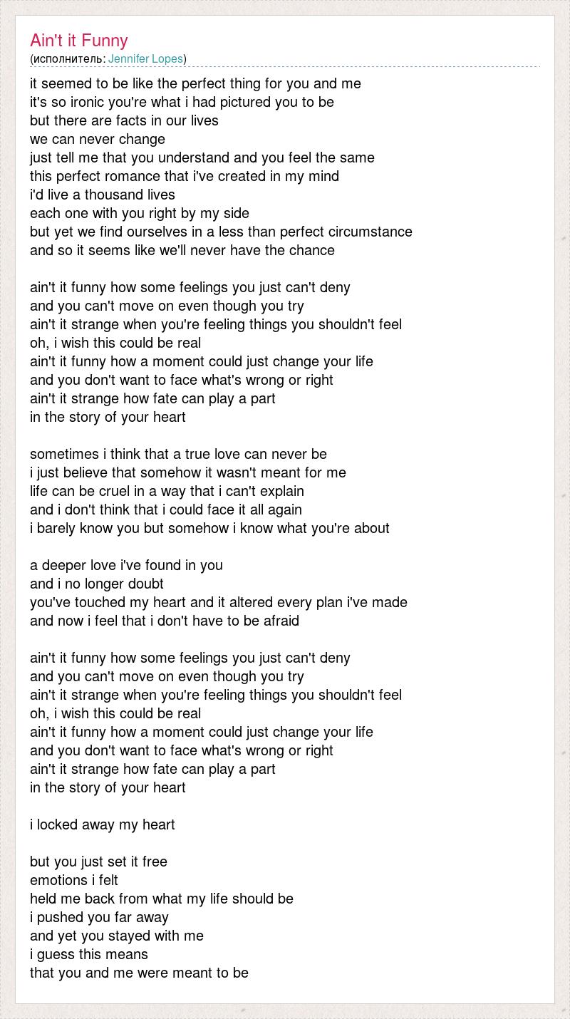 it seemed to be like the perfect thing for you and me it's so ironic you're what i had pictured you to be but there are facts in our lives we can never change just tell me that you understand and you feel the same this perfect romance that i've created in my mind i'd live a thousand lives each one with you right by my side but yet we find ourselves in a less than perfect circumstance and so it seems like we'll never have the chance ain't it funny how some feelings you just can't deny and you can't move on even though you try ain't it strange when you're feeling things you shouldn't feel oh, i wish this could be real ain't it funny how a moment could just change your life and you don't want to face what's wrong or right ain't it strange how fate can play a part in the story of your heart sometimes i think that a true love can never be i just believe that somehow it wasn't meant for me life can be cruel in a way that i can't explain and i don't think that i could face it all again i barely know you but somehow i know what you're about a deeper love i've found in you and i no longer doubt you've touched my heart and it altered every plan i've made and now i feel that i don't have to be afraid ain't it funny how some feelings you just can't deny and you can't move on even though you try ain't it strange when you're feeling things you shouldn't feel oh, i wish this could be real ain't it funny how a moment could just change your life and you don't want to face what's wrong or right ain't it strange how fate can play a part in the story of your heart i locked away my heart but you just set it free emotions i felt held me back from what my life should be i pushed you far away and yet you stayed with me i guess this means that you and me were meant to be