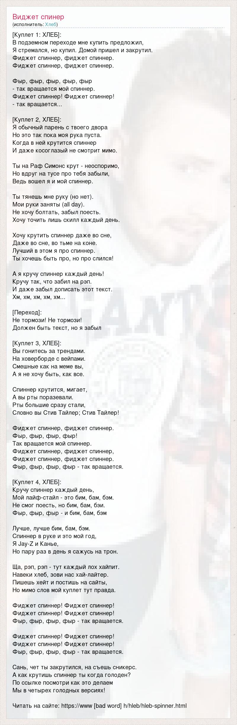 [Куплет 1: ХЛЕБ]: В подземном переходе мне купить предложил, Я стремался, но купил. Домой пришел и закрутил. Фиджет спиннер, фиджет спиннер. Фиджет спиннер, фиджет спиннер. Фыр, фыр, фыр, фыр, фыр - так вращается мой спиннер. Фиджет спиннер! Фиджет спиннер! - так вращается... [Куплет 2, ХЛЕБ]: Я обычный парень с твоего двора Но это так пока моя рука пуста. Когда в ней крутится спиннер И даже косоглазый не смотрит мимо. Ты на Раф Симонс крут - неоспоримо, Но вдруг на тусе про тебя забыли, Ведь вошел я и мой спиннер. Ты тянешь мне руку (но нет). Мои руки заняты (all day). Не хочу болтать, забыл поесть. Хочу точить лишь скилл каждый день. Хочу крутить спиннер даже во сне, Даже во сне, во тьме на коне. Лучший в этом я про спиннер. Ты хочешь быть про, но про слился! А я кручу спиннер каждый день! Кручу так, что забил на рэп. И даже забыл дописать этот текст. Хм, хм, хм, хм, хм... [Переход]: Не тормози! Не тормози! Должен быть текст, но я забыл [Куплет 3, ХЛЕБ]: Вы гонитесь за трендами. На ховерборде с вейпами. Смешные как на меме вы, А я не хочу быть, как все. Спиннер крутится, мигает, А вы рты поразевали. Рты большие сразу стали, Словно вы Стив Тайлер; Стив Тайлер! Фиджет спиннер, фиджет спиннер. Фыр, фыр, фыр, фыр! Так вращается мой спиннер. Фиджет спиннер, фиджет спиннер, Фиджет спиннер, фиджет спиннер. Фыр, фыр, фыр, фыр - так вращается. [Куплет 4, ХЛЕБ]: Кручу спиннер каждый день, Мой лайф-стайл - это бим, бам, бэм. Не смог поесть, но бим, бам, бэи. Фыр, фыр, фыр - и бим, бам, бэм Лучше, лучше бим, бам, бэм. Спиннер в руке и это мой год, Я Jay-Z и Канье, Но пару раз в день я сажусь на трон. Ща, рэп, рэп - тут каждый лох хайпит. Навеки хлеб, зови нас хай-лайтер. Пишешь хейт и постишь на сайты, Но мимо слов мой куплет тут правда. Фиджет спиннер! Фиджет спиннер! Фиджет спиннер! Фиджет спиннер! Фыр, фыр, фыр, фыр - так вращается. Фиджет спиннер! Фиджет спиннер! Фиджет спиннер! Фиджет спиннер! Фыр, фыр, фыр, фыр - так вращается. Сань, чет ты закрутился, на съешь сникерс. А как крутишь спиннер ты когда голоден? По ссылке посмотри как это делаем Мы в четырех голодных версиях! Читать на сайте: https://www [bad word] h/hleb/hleb-spinner.html