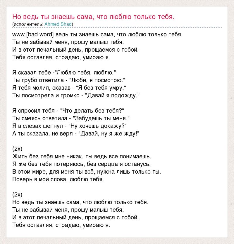 www [bad word] ведь ты знаешь сама, что люблю только тебя. Ты не забывай меня, прошу малыш тебя. И в этот печальный день, прощаемся с тобой. Тебя оставляя, страдаю, умираю я. Я сказал тебе -"Люблю тебя, люблю." Ты грубо ответила - "Люби, я посмотрю." Я тебя молил, сказав - "Я без тебя умру." Ты посмотрела и громко - "Давай я подожду." Я спросил тебя - "Что делать без тебя?" Ты смеясь ответила - "Забудешь ты меня." Я в слезах шепнул - "Ну хочешь докажу?" А ты сказала, не веря - "Давай, ну я же жду!" (2х) Жить без тебя мне никак, ты ведь все понимаешь. Я же без тебя потеряюсь, без сердца я останусь. В этом мире, для меня ты всё, нужна лишь только ты. Поверь в мои слова, люблю тебя. (2х) Но ведь ты знаешь сама, что люблю только тебя. Ты не забывай меня, прошу малыш тебя. И в этот печальный день, прощаемся с тобой. Тебя оставляя, страдаю, умираю я.