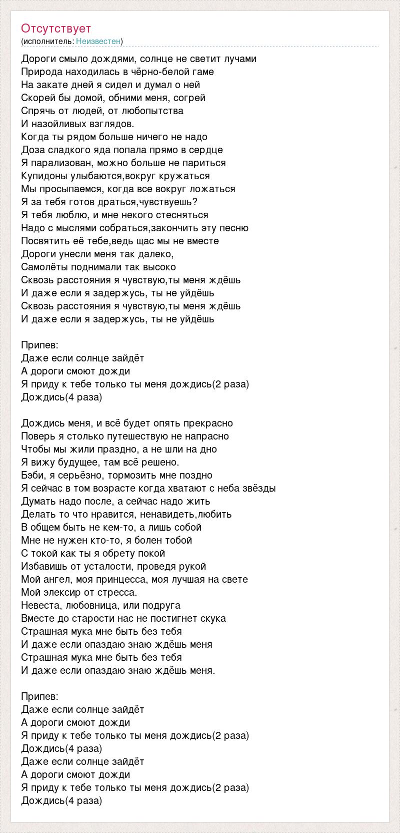 Дороги смыло дождями, солнце не светит лучами Природа находилась в чёрно-белой гаме На закате дней я сидел и думал о ней Скорей бы домой, обними меня, согрей Спрячь от людей, от любопытства И назойливых взглядов. Когда ты рядом больше ничего не надо Доза сладкого яда попала прямо в сердце Я парализован, можно больше не париться Купидоны улыбаются,вокруг кружаться Мы просыпаемся, когда все вокруг ложаться Я за тебя готов драться,чувствуешь? Я тебя люблю, и мне некого стесняться Надо с мыслями собраться,закончить эту песню Посвятить её тебе,ведь щас мы не вместе Дороги унесли меня так далеко, Самолёты поднимали так высоко Сквозь расстояния я чувствую,ты меня ждёшь И даже если я задержусь, ты не уйдёшь Сквозь расстояния я чувствую,ты меня ждёшь И даже если я задержусь, ты не уйдёшь Припев: Даже если солнце зайдёт А дороги смоют дожди Я приду к тебе только ты меня дождись(2 раза) Дождись(4 раза) Дождись меня, и всё будет опять прекрасно Поверь я столько путешествую не напрасно Чтобы мы жили праздно, а не шли на дно Я вижу будущее, там всё решено. Бэби, я серьёзно, тормозить мне поздно Я сейчас в том возрасте когда хватают с неба звёзды Думать надо после, а сейчас надо жить Делать то что нравится, ненавидеть,любить В общем быть не кем-то, а лишь собой Мне не нужен кто-то, я болен тобой С токой как ты я обрету покой Избавишь от усталости, проведя рукой Мой ангел, моя принцесса, моя лучшая на свете Мой элексир от стресса. Невеста, любовница, или подруга Вместе до старости нас не постигнет скука Страшная мука мне быть без тебя И даже если опаздаю знаю ждёшь меня Страшная мука мне быть без тебя И даже если опаздаю знаю ждёшь меня. Припев: Даже если солнце зайдёт А дороги смоют дожди Я приду к тебе только ты меня дождись(2 раза) Дождись(4 раза) Даже если солнце зайдёт А дороги смоют дожди Я приду к тебе только ты меня дождись(2 раза) Дождись(4 раза)