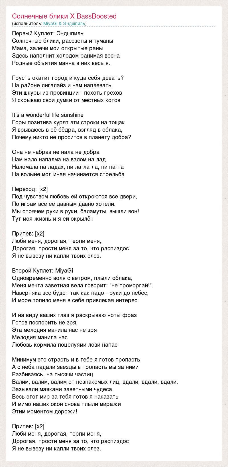 Первый Куплет: Эндшпиль Солнечные блики, рассветы и туманы Мама, залечи мои открытые раны Здесь наполнит холодом ранимая весна Родные объятия манна в них весь я. Грусть окатит город и куда себя девать? На районе лигалайз и нам наплевать. Эти шкуры из провинции - похоть грехов Я скрываю свои думки от местных котов It’s a wonderful life sunshine Горы позитива курят эти строки на тощак Я врываюсь в её бёдра, взгляд в облака, Почему никто не просится в планету добра? Она не набрав не нала не добра Нам мало напалма на валом на лад Наломала на ладах, ни ла-ла-ла, ни на-на На волыне мол иная начинается стрельба Переход: [х2] Под чувством любовь ей откроются все двери, По играм все ее давным давно хотели. Мы спрячем руки в руки, баламуты, вышли вон! Тут моя жизнь и я ей окрылён Припев: [х2] Люби меня, дорогая, терпи меня, Дорогая, прости меня за то, что распиздос Я не вывезу ни капли твоих слез. Второй Куплет: MiyaGi Одновременно воля с ветром, плыли облака, Меня мечта заветная вела говорит: "не проморгай!". Наверняка все будет так как надо - руки до небес, И море топило меня в себе привлекая интерес И на виду ваших глаз я раскрываю ноты фраз Готов поспорить не зря. Эта мелодия манила нас не зря Мелодия манила нас Любовь кормила поцелуями лови напас Минимум это страсть и в тебе я готов пропасть А с неба падали звезды в пропасть мы за ними Разбиваясь, на тысячи частиц Валим, валим, валим от незнакомых лиц, вдали, вдали, вдали. Зазывали маяками заветными чудеса Весь этот мир за тебя готов я наказать И мимо наших окон снова плыли миражи Этим моментом дорожи! Припев: [х2] Люби меня, дорогая, терпи меня, Дорогая, прости меня за то, что распиздос Я не вывезу ни капли твоих слез.